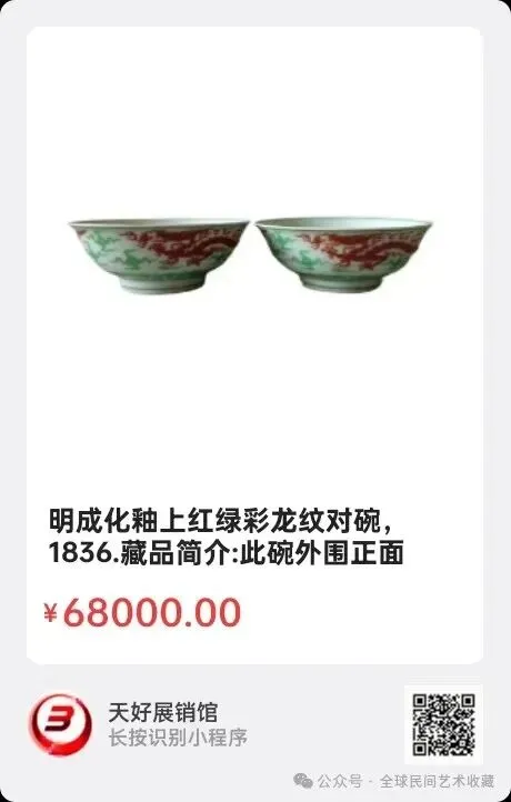 明成化釉上红绿彩龙纹对碗,尺寸:口径19cm,高7cm,底径8.7cm,藏品简介:此碗外围正面红彩龙纹为主,周身绿彩配以云纹为副,底周以红绿彩连瓣纹装饰,整体龙纹形像生动,有似立体效果,碗内底赐一动感龙纹更现大气豪迈,底款青花书体大明成化年制,符合成化款体格式!来源1836.