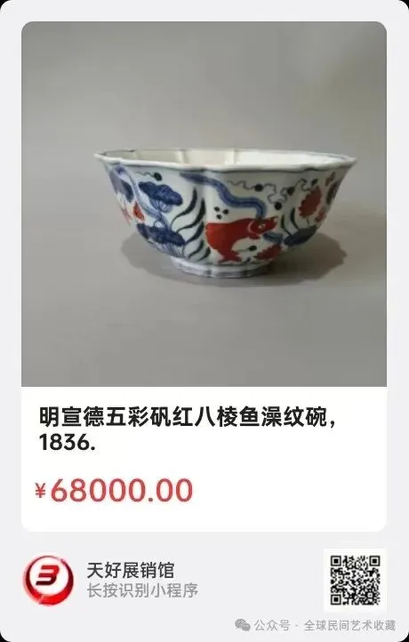明宣德五彩矾红八棱鱼澡纹碗,高10cm,口22.6cm,底9.9cm,来源1836.