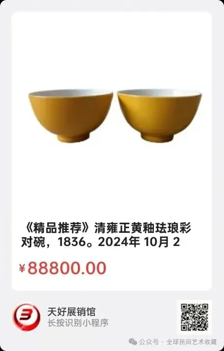 清雍正黄釉珐琅彩对碗,高6cm,口10.5cm,底4.2cm。雍正时烧制柠檬黄色单色瓷,(也称帝王黄),因其黄如柠檬,故称。是以铁为着色剂的低温黄釉。制作方法是先高温烧成白釉瓷,在白釉上施铁黄釉,入窑二次烤成。柠檬黄釉因其颜色比传统浇黄釉更为浅淡幽雅,故又称为“淡黄釉”。柠檬黄釉以氧化锑为主要呈色剂,为低温色釉。清代文献称之为“西洋黄”、“洋黄”。雍正十三年唐英撰《陶成纪事》记载了“岁例供御”的五十七种彩、釉,其中的“西洋黄色器皿”所指便是柠檬黄釉。这对小碗外底黄釉满身,内膛底珐琅彩绘桃子一只,衬托强烈对比下特别贵气不失高雅,底款六字正本方圈,足墙胎白细腻,雍正黄釉器虽不像弘治时期施釉肥润,色泽明快却胜弘治一筹。此碗外施黄釉,施釉细腻而均匀,釉色为柠檬黄色,清朗明快,是传世所见雍正朝柠檬黄釉质量极好的。2024年 10月 23日,经天好评审团评审,以7票优势荣登精品榜,获第148期天好海选精品。来源1836。