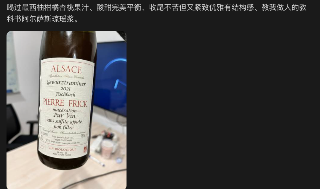 即便是国外知名的自然酒买手网站,也是火爆到几乎全线售罄。为啥红?讲真,只能是因为好。库存太少甚至不可能寄给很多评论家去品鉴,自家网站也是简陋得像个摆设,但是葡萄酒豆瓣网上,vivino上一水的4星(能拿4星基本上已经是10%的水平了)。这家酒庄叫Andreas Mann,酒庄来自德国莱茵黑森,这里本来就是与摩泽尔齐名的好产区:土壤类型丰富(德国13个产区里最复杂多样的),近年也冒出不少新锐酿酒师,整体风格多样性和品质都在提升!酿酒师兼庄主Andreas Mann是一位奇才,商科出身半路转专业酿酒,2017年才开始正式瓶装自己的酒,但是出道就备受欢迎。顺便,跟我们之前安利的你个死鬼一样,Andreas除了自己能力强,还有家族酒庄的加成。他们家传到Andreas这已经是第11代!家族老早就占到了出色的地块,酿酒知识的厚度,也不是一般新锐酿酒师能够相比的。今天给大家安利他们家的招牌灰皮诺,酒名叫“木得感情的酒精容器”(名字是进口商根据酒标自己取的?)。是的,虽然莱茵黑森雷司令非常牛,但它家却是灰皮诺表现更出色(酒庄旗舰款也是灰皮诺)。好喝的秘密,就是家里地块的土壤组成。家族有莱茵黑森少数的石灰质土壤葡萄园,提供了良好的储水能力,为越来越常见的干旱夏季保驾护航,而且还带来了一种非常微妙的烟熏感气息,收敛又迷人。只用50%的葡萄带皮天然发酵两周,浸出草莓汁一样的橘红色(灰皮诺虽然是白葡萄品种,但是本身其实是有一点红色的),芳香之余很有Mann自己的风格,香气如泉般透彻。入口果味充沛,轻柔的树莓、樱桃、橙子皮香气灵动,中后段带出一点锡兰红茶、甘草、赤豆的香料气息,以及烟熏质感的矿物风味,喝过之后很难忘记。Pierre Frick GewurztraminerPierre Frick这家酒庄,是属于喝完之后,有点让人“醍醐灌顶”的??酒庄。因为它把我们以往认为甜腻肥美的琼瑶浆,做出了一种完全不同,并且张力十足的美丽风格,令人直呼“原来还能这样!”的好喝。庄主兼酿酒师Jean-Pierre Frick本人,被酒圈同行评价为“极端前卫”,是一位想法极野,但技术也同样过硬的天才。他是整个阿尔萨斯产区生物动力法的先驱,早在1970年,大部分酒庄都还在努力现代技术的时候,他已经开始进行有机耕种了。80年代的时候,他开始全面转向生物动力法耕种,到了1991年的时候,甚至转向了会更加爱先锋的耕作方式:完全不使用旋转工具耕作土地,来更好保持土壤的结构。比如,为了最大程度表现风土,他舍弃了可能影响葡萄酒风味的木塞,改用不锈钢瓶盖,哪怕10瓶可能只有1瓶受影响。第二,他只用旧橡木桶酿酒,大多具有百年历史(几乎不会给酒液增添味道),还是3000升的大桶(桶越大,对葡萄酒风味影响越小)。今天这支琼瑶浆,也是酒庄的招牌之一,绝不是一支传统意义上的傻白甜琼瑶浆。极具穿透力的酸度,承载密集的甜美果味,红樱桃、石榴、西柚、柑橘糖,像鼓点密集的摇滚乐在嘴里铺开。完全没有琼瑶浆后段常见的苦味,这质感太绝了,教科书级别解释了什么叫明亮甜美。因为本身已经是非常非常红的先驱酒庄,全世界都在蹲它家配额。一般小酒馆都是2倍价起卖了,我们这次争取超美好的价格,非常推荐大家尝尝看。