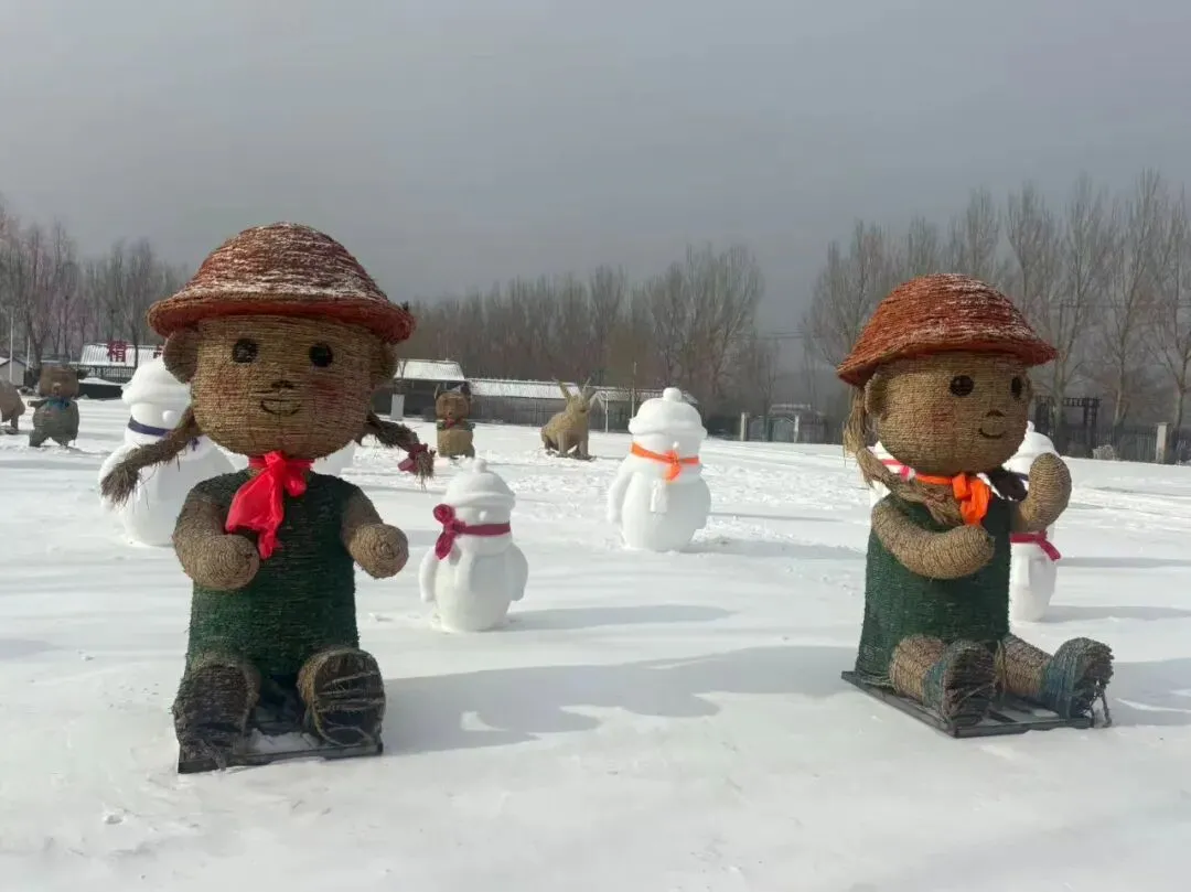 走出温暖的展馆,冬日的快乐也已上线。雪地上,两组稻草人憨态可掬,棕红草帽落着薄雪,深绿衣裳系着红橙丝带,圆脸上黑亮眼珠似含笑意;身后雪人“天团”各有模样,橙色围巾、红围巾点缀其间,在冬日寒风中更显鲜活年味。此外,雪滑梯、草迷宫等项目已就绪,市民可以在这里解锁冰雪玩乐新体验。