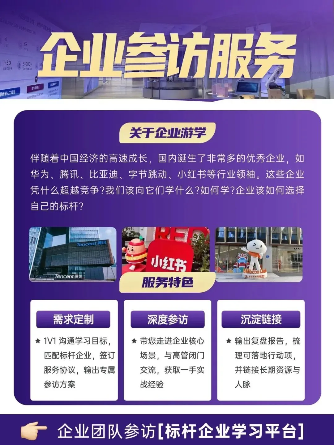 我们提供 1V1 定制游学方案,精准匹配企业学习需求,为您输出专属参访方案,带您深入标杆企业,梳理可行行动项,链接长期资源与人脉,找到属于企业的进阶之路。