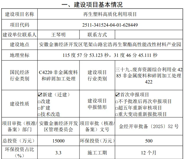 安徽日亿新材料科技有限公司再生塑料高质化利用项目位于安徽金寨经济开发区清水路与新四路交叉口。该项目计划租赁已建成的宏浩再生聚酯高性能改性材料产业园内多栋厂房,总建筑面积达到44952.32平方米。项目总投资1.5亿,环保投资500万元。