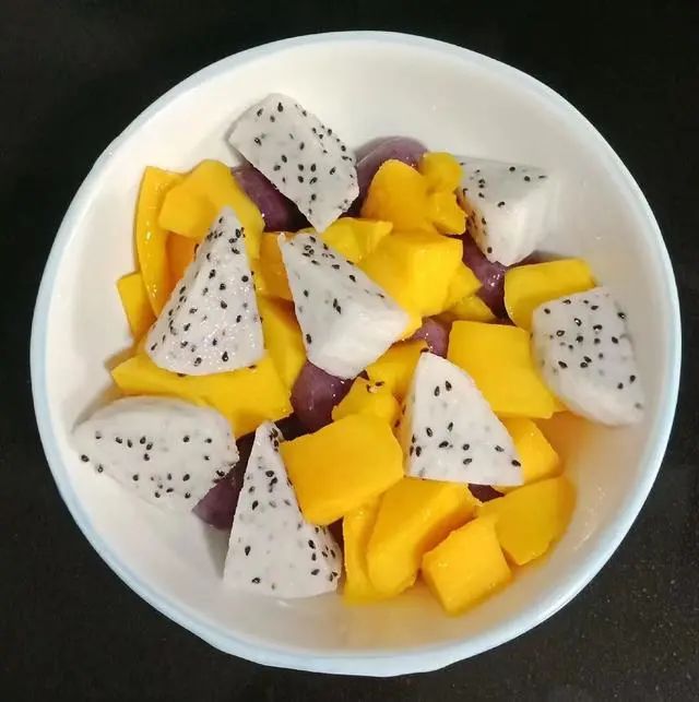 7.芋圆沥干水分后倒入碗中,加入芒果和火龙果