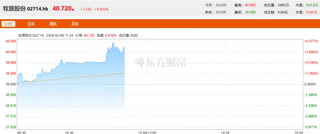 仪式现场,牧原股份董事长秦英林与公司首席财务官高曈共同敲响上市钟声。正式开盘后,牧原股份股价一度上涨至40.980港元,涨幅高达4.97%。