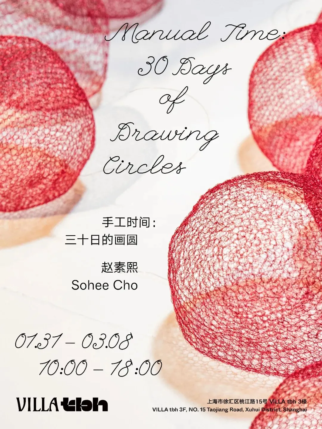 本次展览试图通过身体与双手的重复性劳动,将艺术家在VILLA tbh度过的三十天时间加以物质化。这种重复性手工劳动,是一种无用的生产 —— 即创造时间的重量、精神的轨迹,以及虚空的形式。赵素熙将时间简化为一种可计数的单位形态,并将时间本身从背景中提取出来,雕琢成可被视觉、触觉与冥想所感知的物质实体。