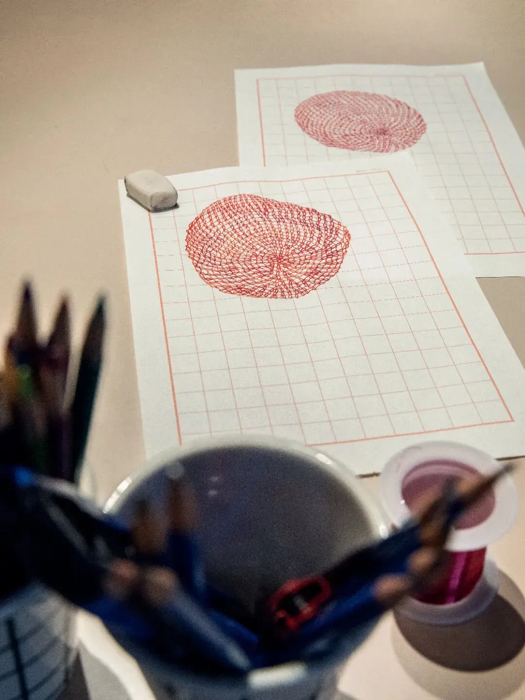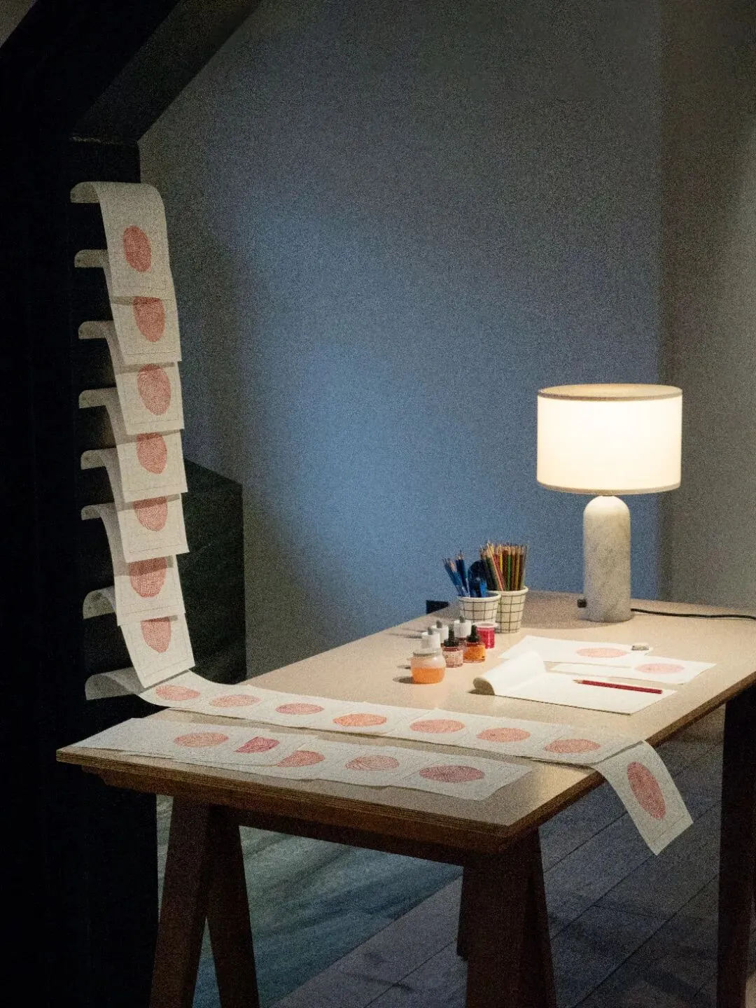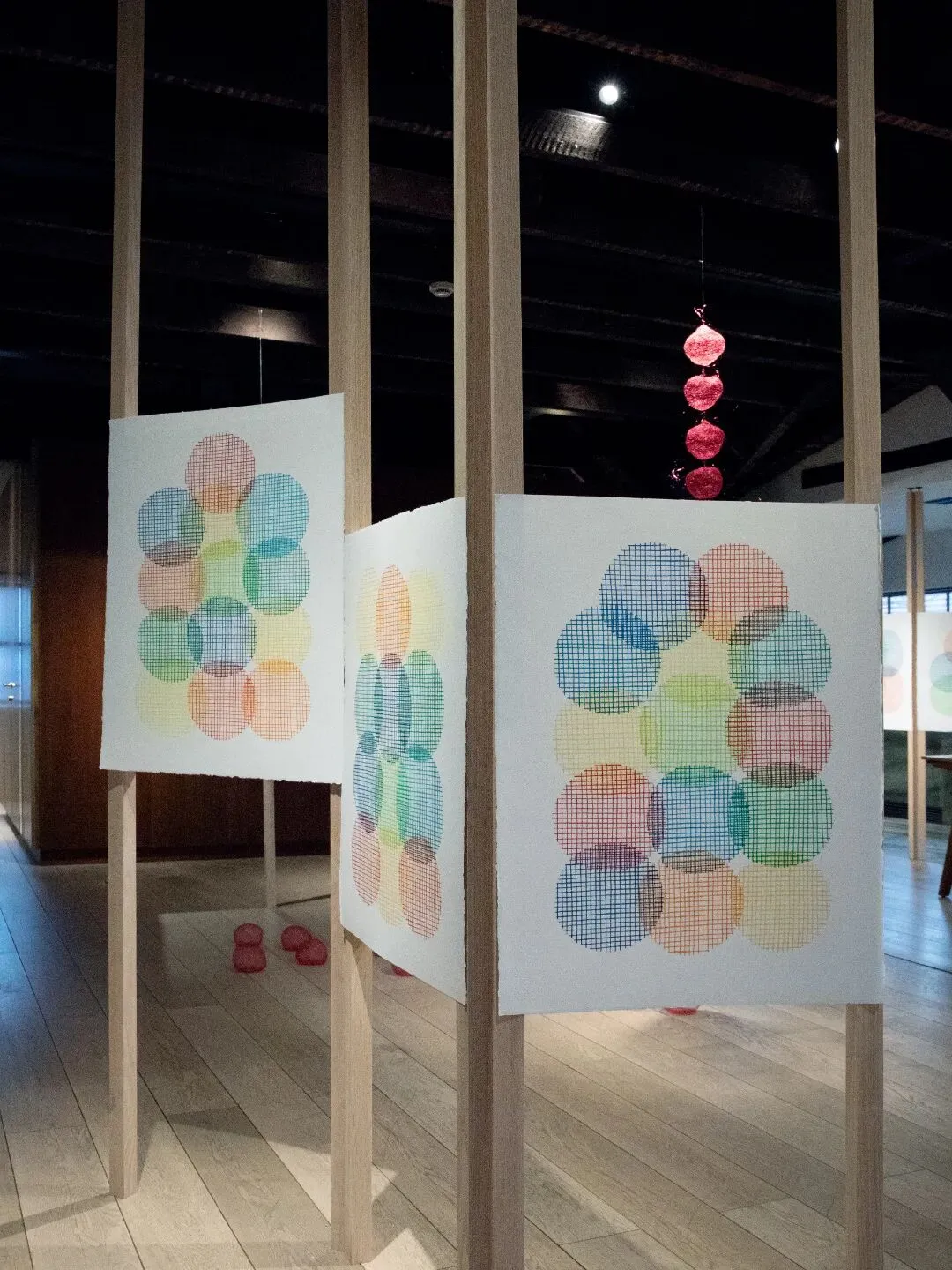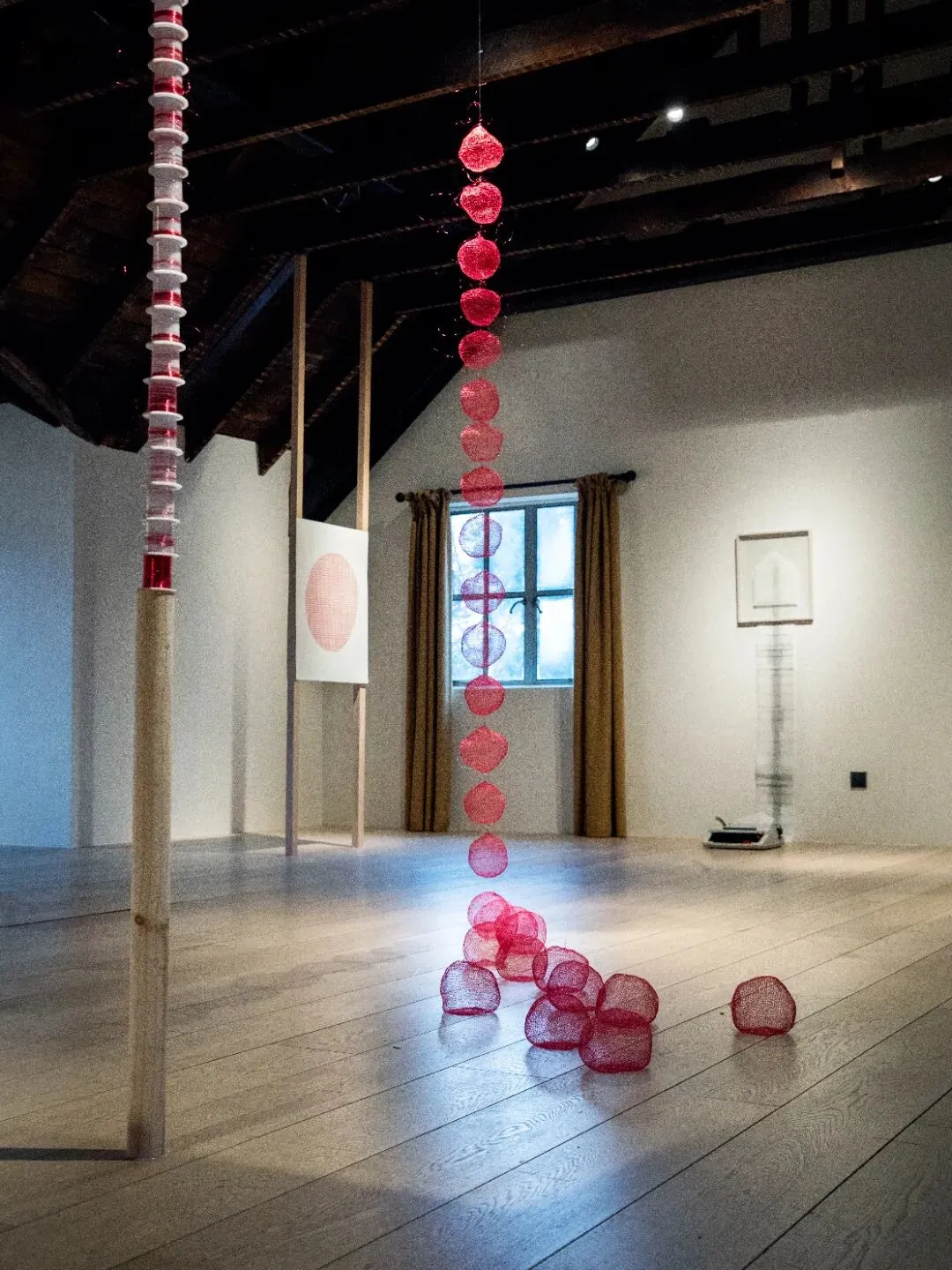 而在田字格本上绘制的三十张红色球体图像,则是将时间单位转化为感性符号的尝试,揭示了重复之中生成的微妙差异。它们与编织作品共同在空间中构建了一个多维的计时系统——一个垂直坠落,一个水平延展;一个关乎虚空与重力,一个关乎色彩与光的本源与知觉。