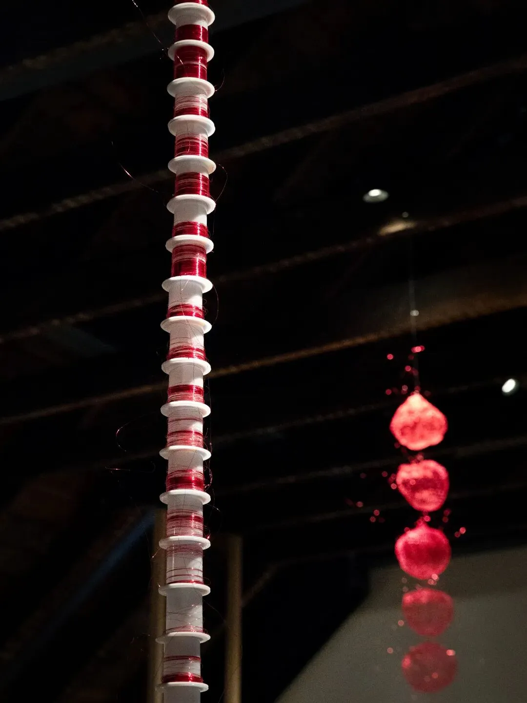 赵素熙的创作,始终在与当代艺术的几个核心命题——身体与时间的在场性、手工劳动的当代价值、非生产性实践的意义进行持续对话。展览中,三十个从屋顶垂落的红色编织球体,宛如一个沉浸式剧场徐徐展开。艺术家以编织的方式制作了三十个红色小球,并将其从天花板垂直悬挂至地面,使时间的坠落与积累得以可视化。