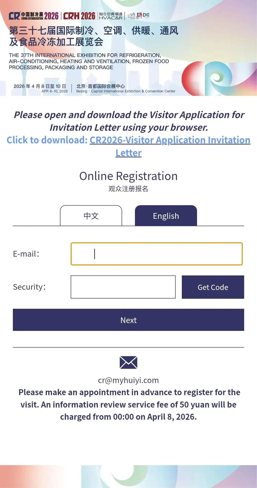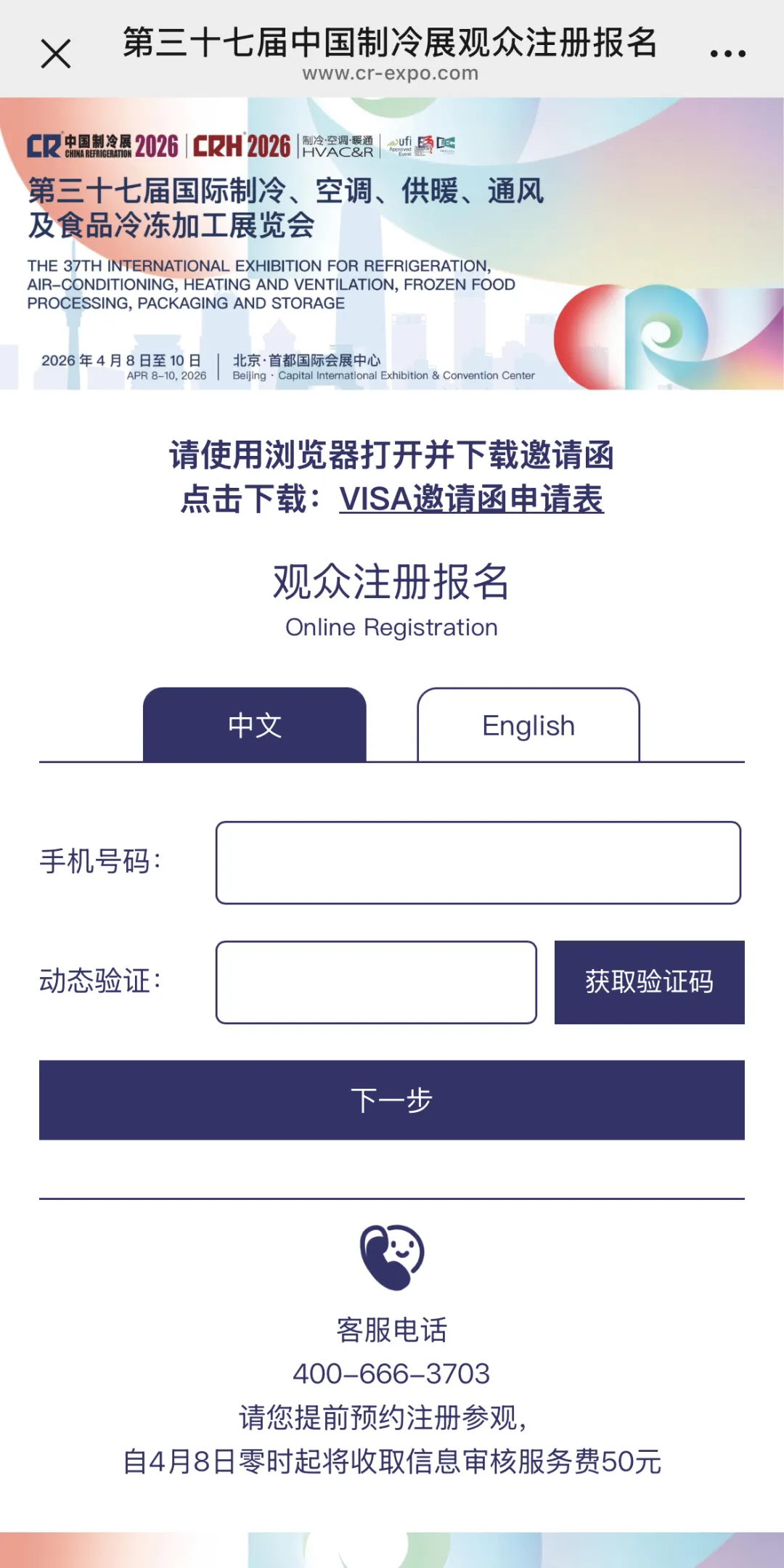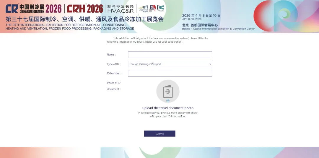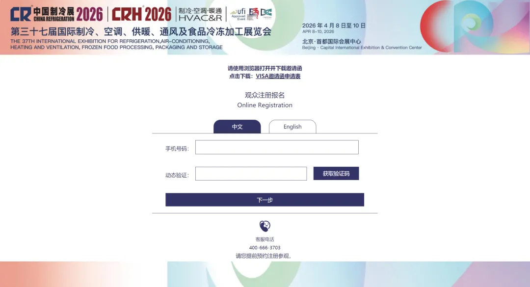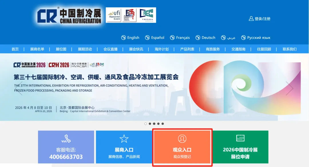 打开中国制冷展官网(https://www.cr-expo.com/en)或微信公众号观众注册菜单,切换语言后选择观众注册。
