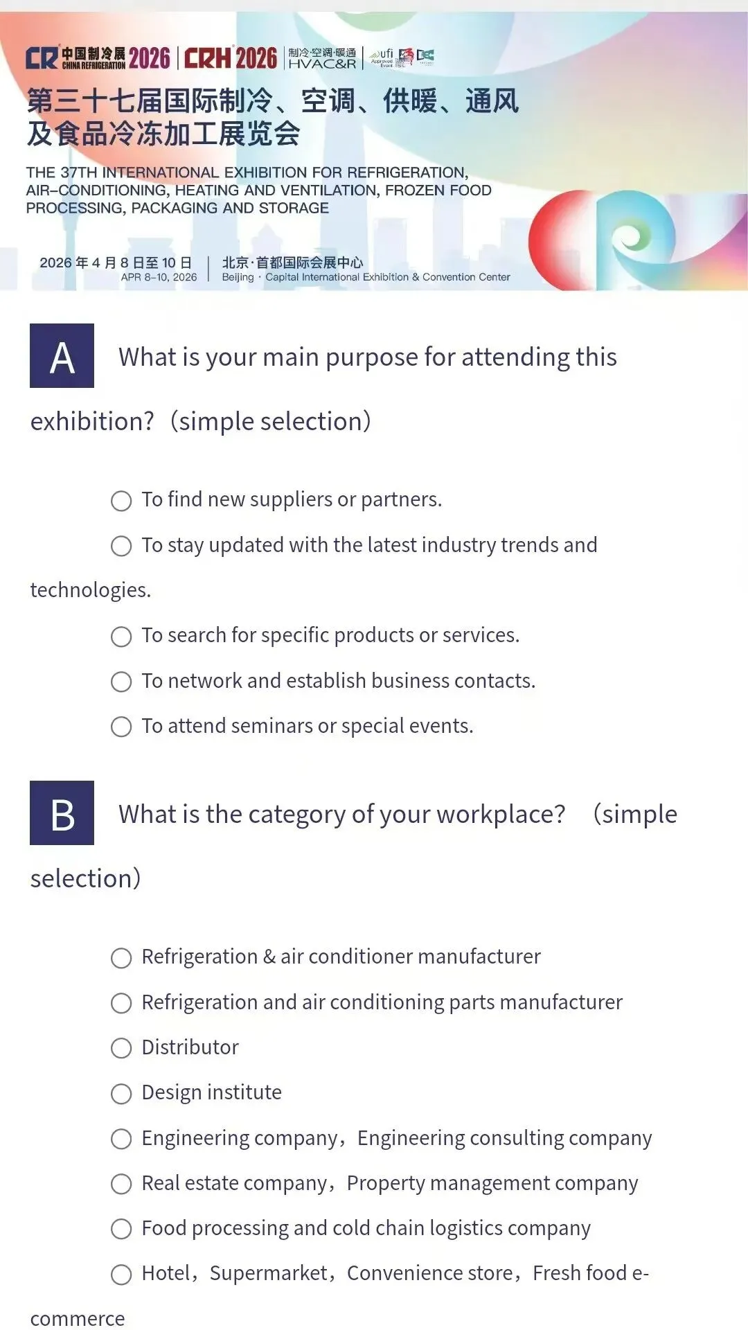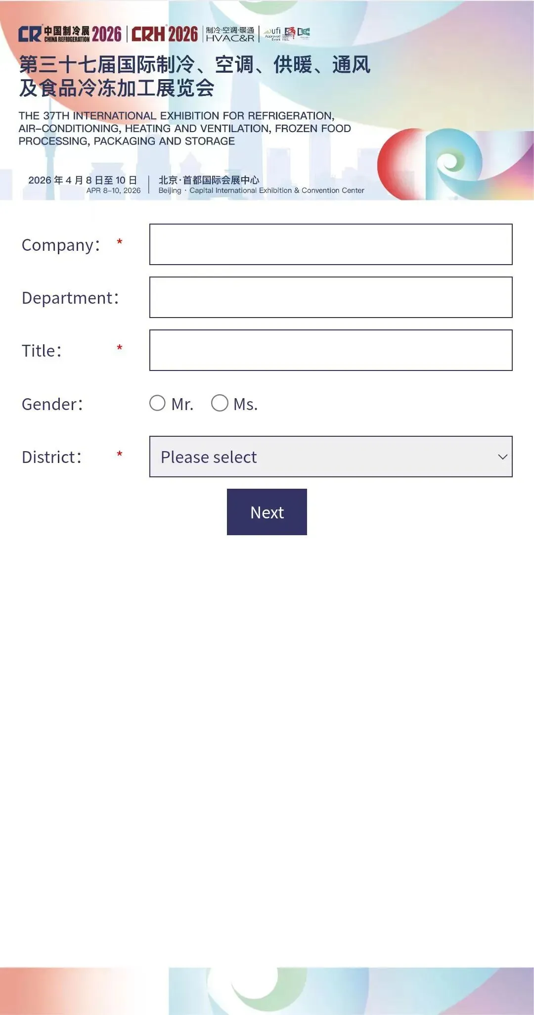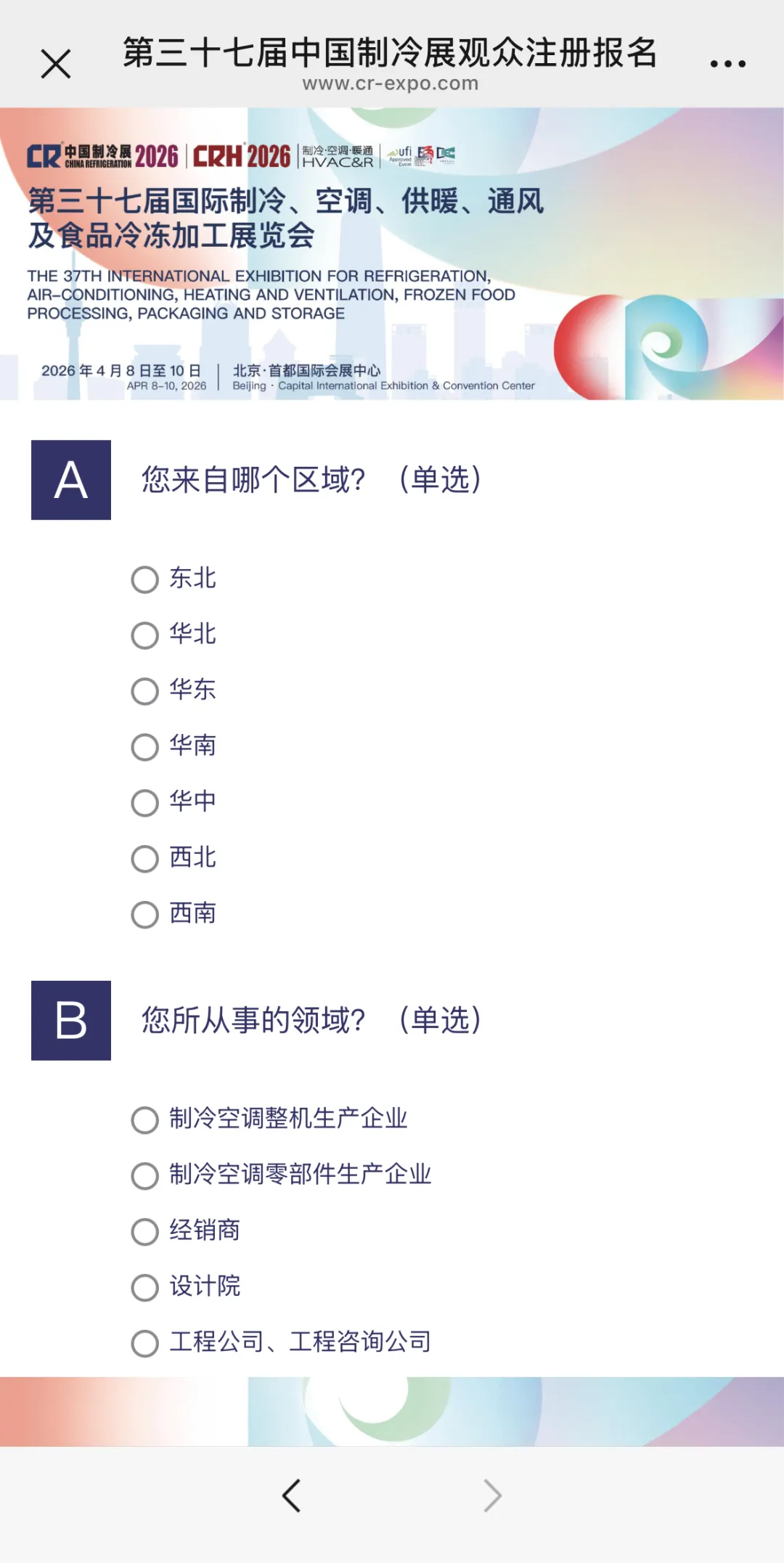 打开中国制冷展官网(https://www.cr-expo.com/en)或微信公众号观众注册菜单,切换语言后选择观众注册。