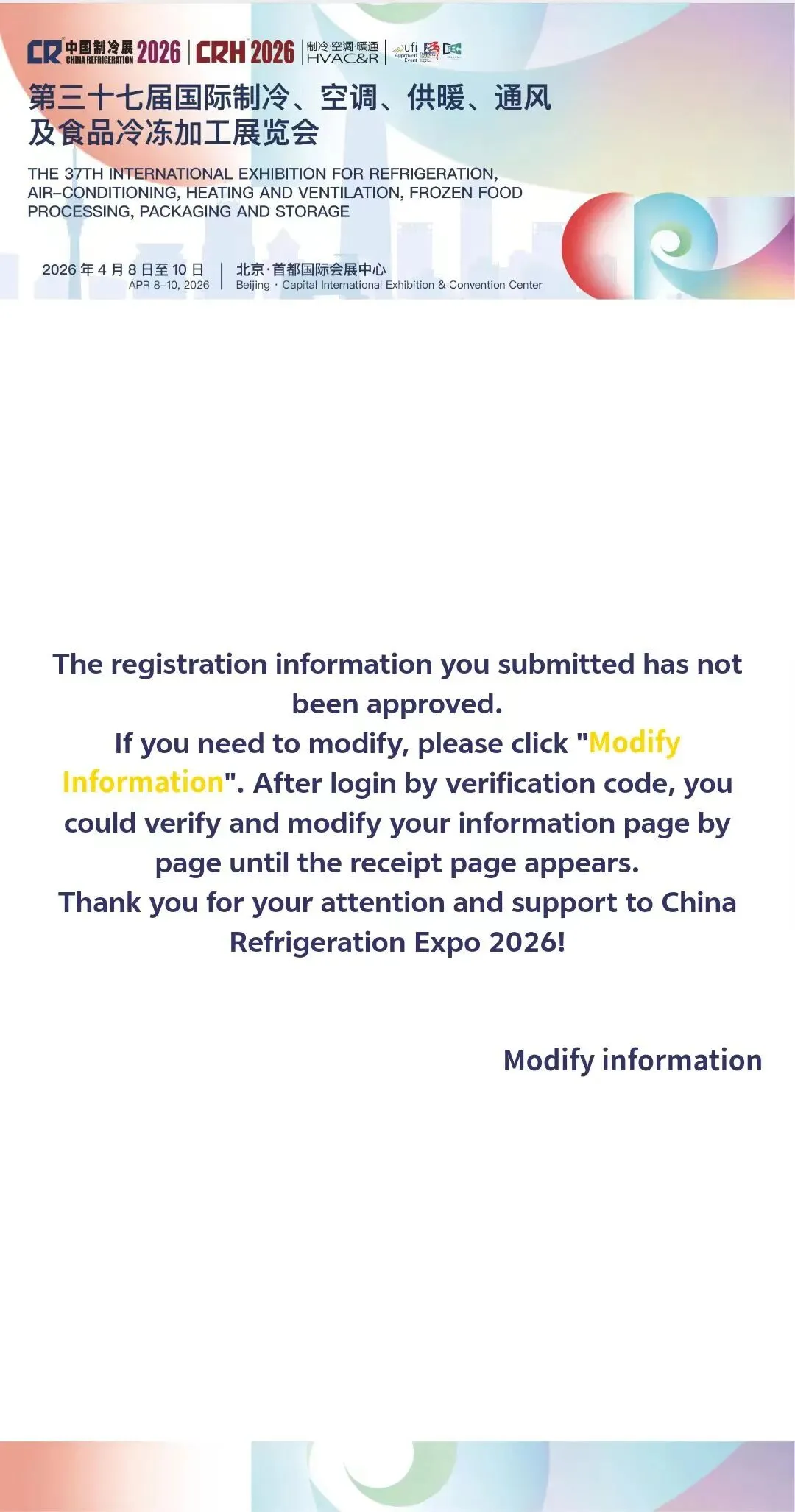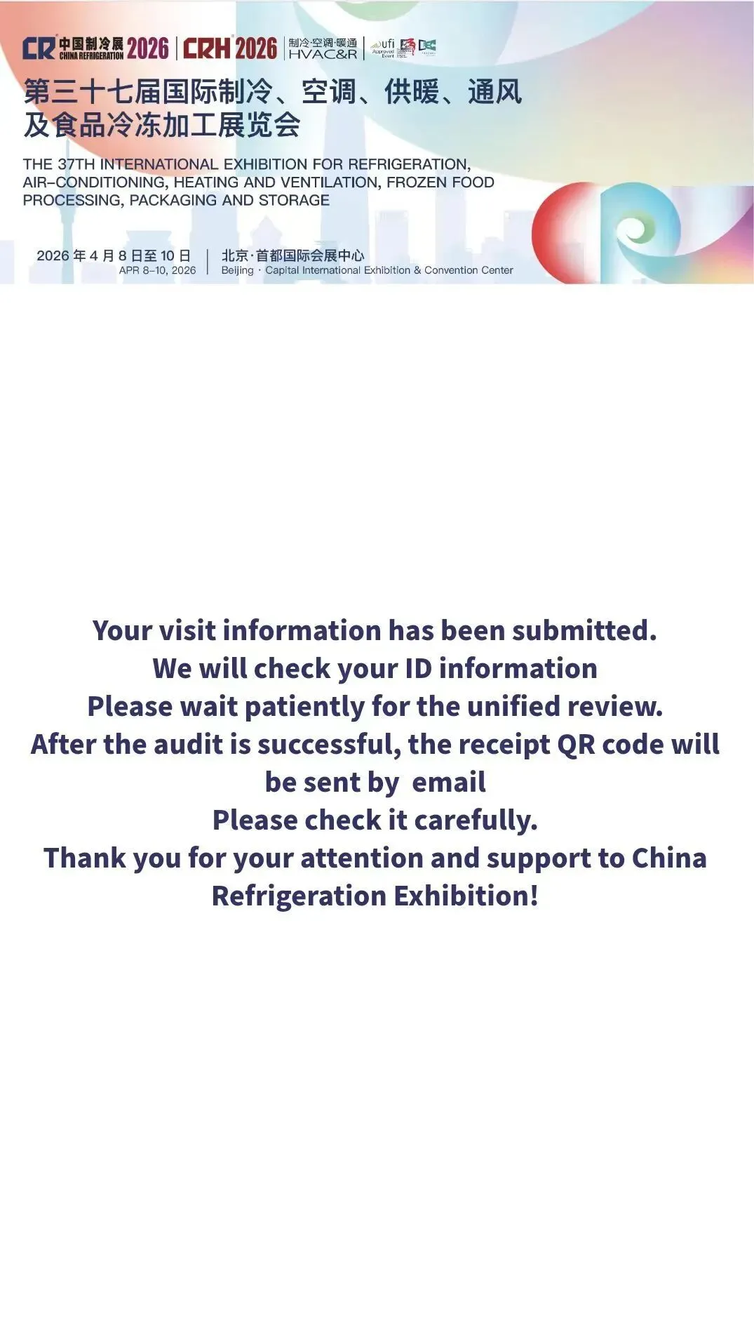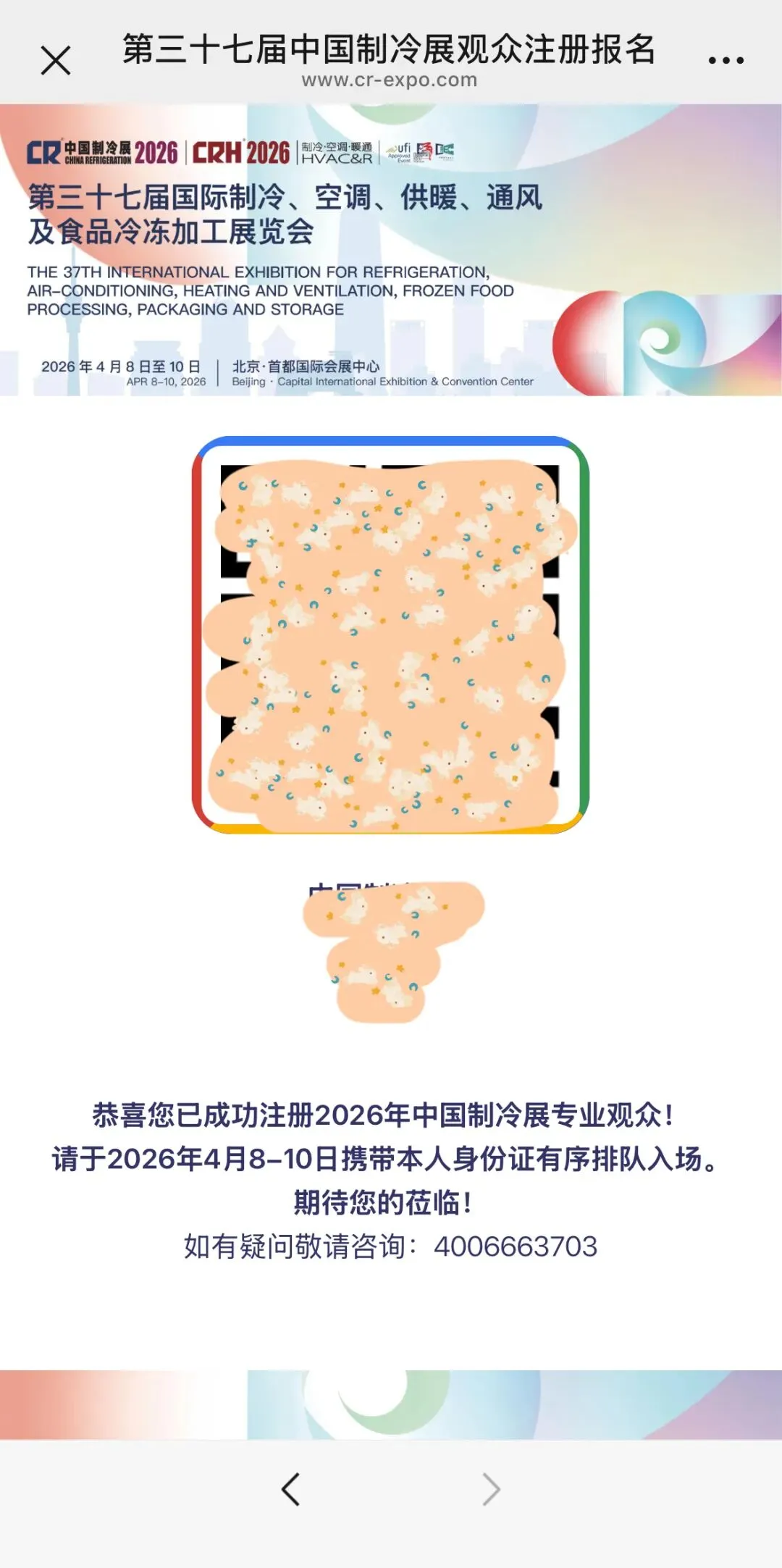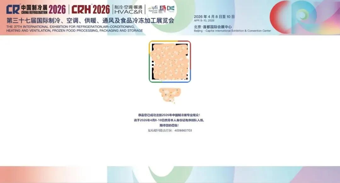 审核通过后,您将收到注册成功的回执邮件,如未收到邮件,也可登录中国制冷展官网或微信公众号查看。请将回执页面二维码保存到手机,现场携带注册时所选证件原件参观。
