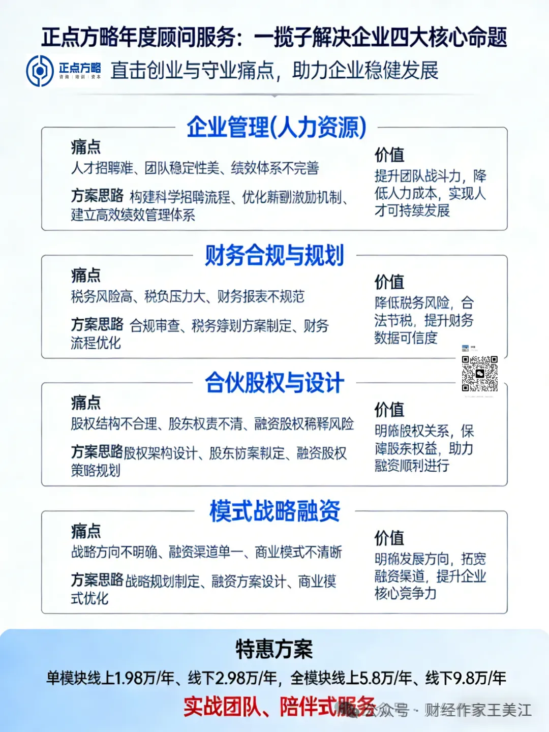 专业提供赋能企业的加速增长赋能陪跑服务、商业模式设计、合伙人与股权设计、薪酬绩效设计、财务与税务筹划设计、降本增效、营销招商文化设计、股权融资与资本上市的企业管理咨询与培训服务,助力企业快速、稳健、安全的裂变发展!