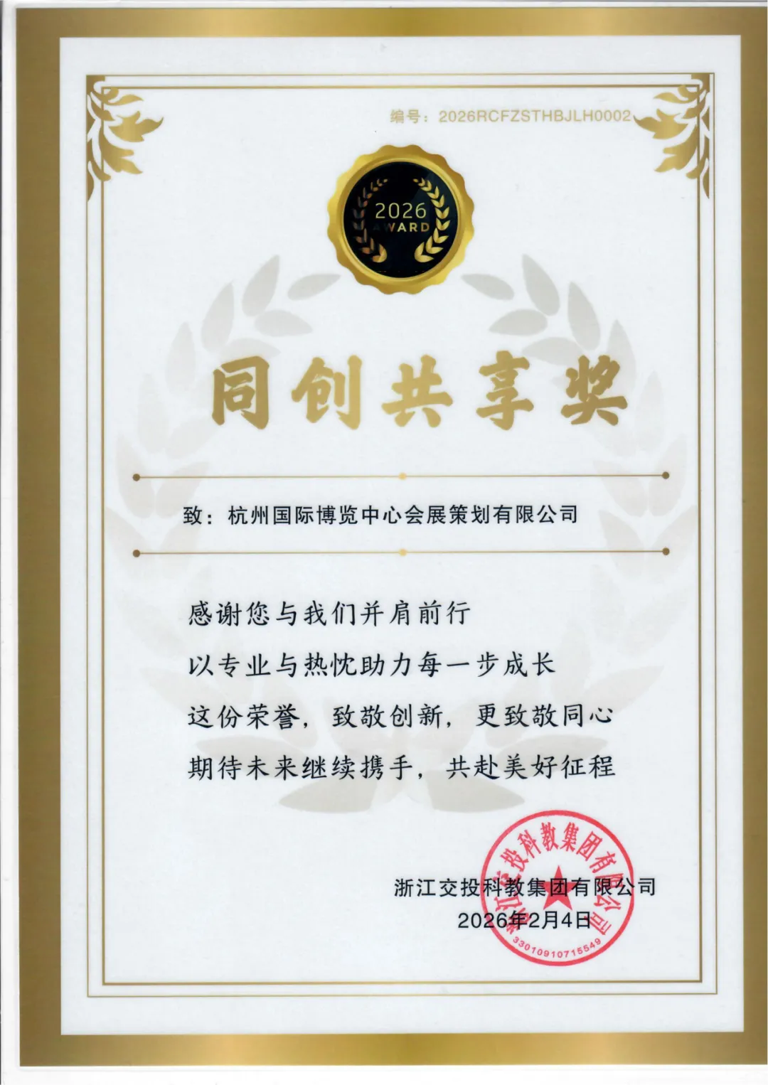杭州国际博览中心会展策划有限公司自2024年浙江科教集团成立至今,期间进行了多次合作。此次2025年度“同创共享奖”既是鼓励,也是会展策划公司的工作动力。未来,杭州国际博览中会展策划有限公司将继续认真落实策划、组织和执行的全套解决方案及服务,不断优化策划服务方案,创新展会模式,全力做好会务保障工作,与浙江科教集团进行更多的深入合作。
