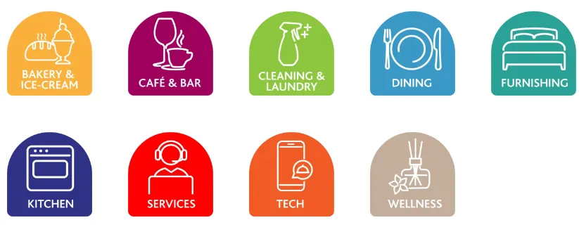 洗衣设备及配件、清洁设备及配件、客房清洁用品、卫生/废物处理、虫害控制服务等。