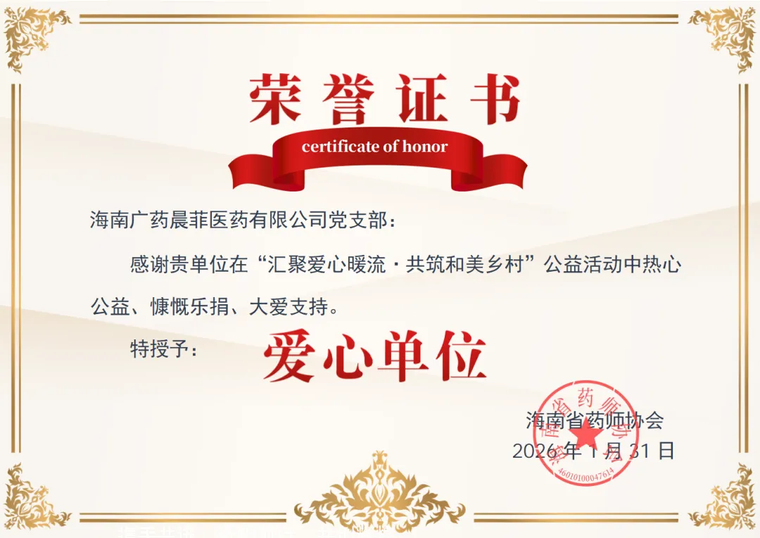 在参与“汇聚爱心暖流·共筑和美乡村”公益活动中,广药晨菲党支部获得海南省药师协会颁发的“爱心单位”证书。