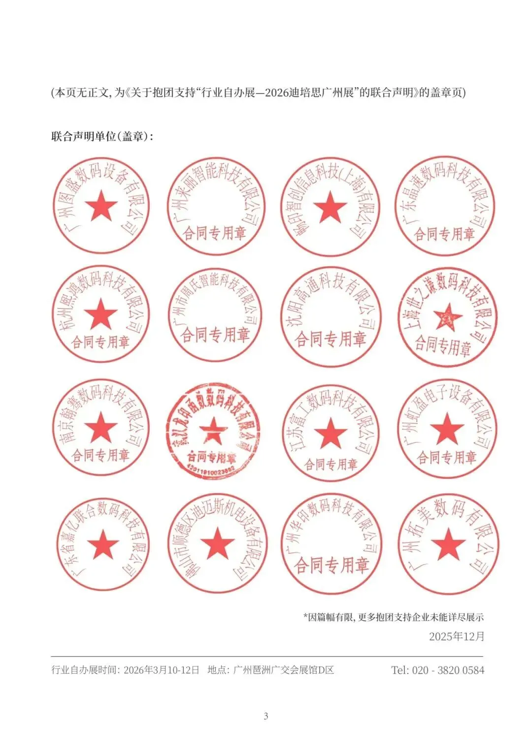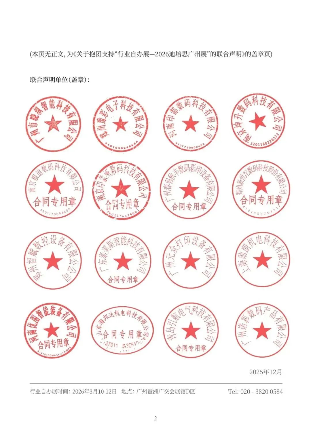 截止今日,行业主流喷墨打印设备制造商:奥威、工正、东川、彩神、汉拓、鼎力、金谷田、润彩、世通、神画、EFI、兰旗、欣科达、乐彩、奥德利、根道、爱印、印象派、春羽秋丰、新世纪、美孚、泰美斯、万拓、雅色兰、AGP优图、海邦达、引航者、诺彩、莱图、来丽智能、睛彩、卡库、周氏、高通、印威图、坤度、龙印、富丽FORNI、虹盈、亿方、迪迈斯、华印、拓美等明确表示全力支持“行业自办展”。