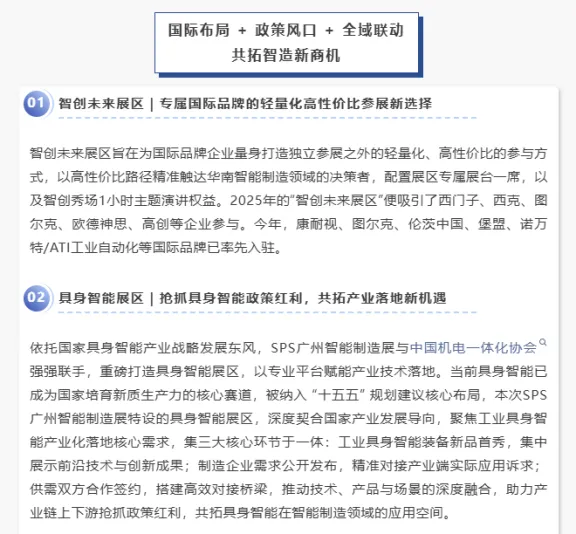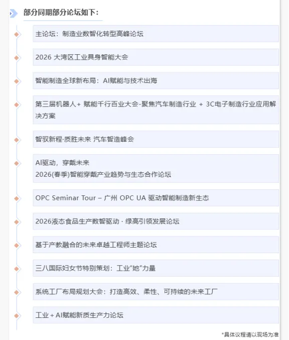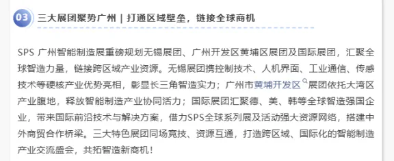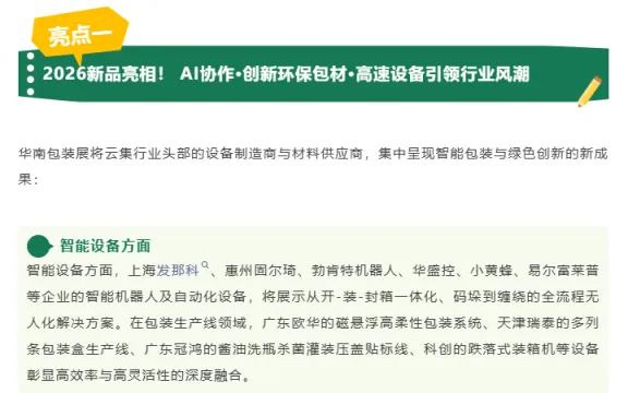 为助力企业把握智能制造与包装行业前沿趋势,南沙企联将于2026年3月5日组织企业前往广州广交会展馆联观两大行业标杆展会。届时,广州国际智能制造技术与装备展览会(SPS–Smart Production Solutions Guangzhou)将集中展示传感技术、驱动系统、工业机器人、控制技术等全链条智能自动化解决方案,深度呈现AI与工业融合的创新应用;同期举办的第三十二届中国国际包装工业展览会(Sino-Pack 2026)暨2026中国(广州)国际包装制品展览会(PACKINNO 2026)则聚焦智能包装设备、环保材料与创意设计,覆盖食品、日化、电商、宠物、餐饮外卖等多元领域,为企业提供从技术对接至市场拓展的一站式资源平台。诚邀各企业共同参与,拓展合作新机遇!具体事项通知如下: