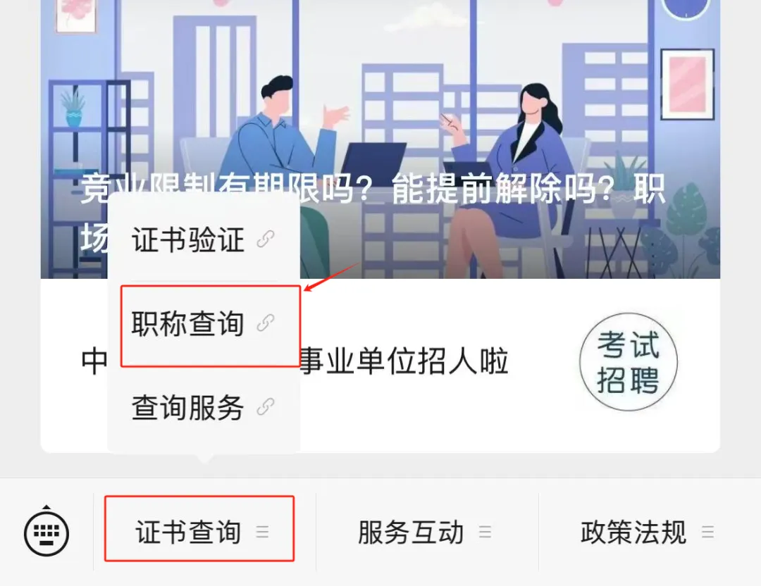 也可通过“人力资源和社会保障部”微信公众号,菜单栏“证书查询”—“职称查询”,进入查询页面