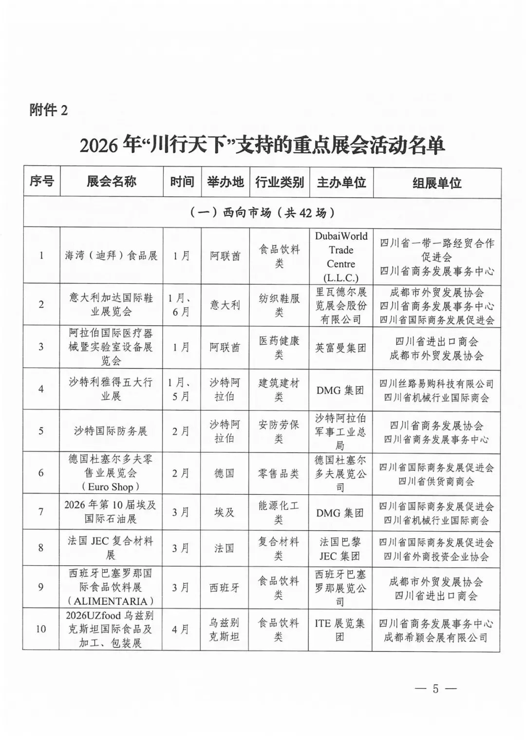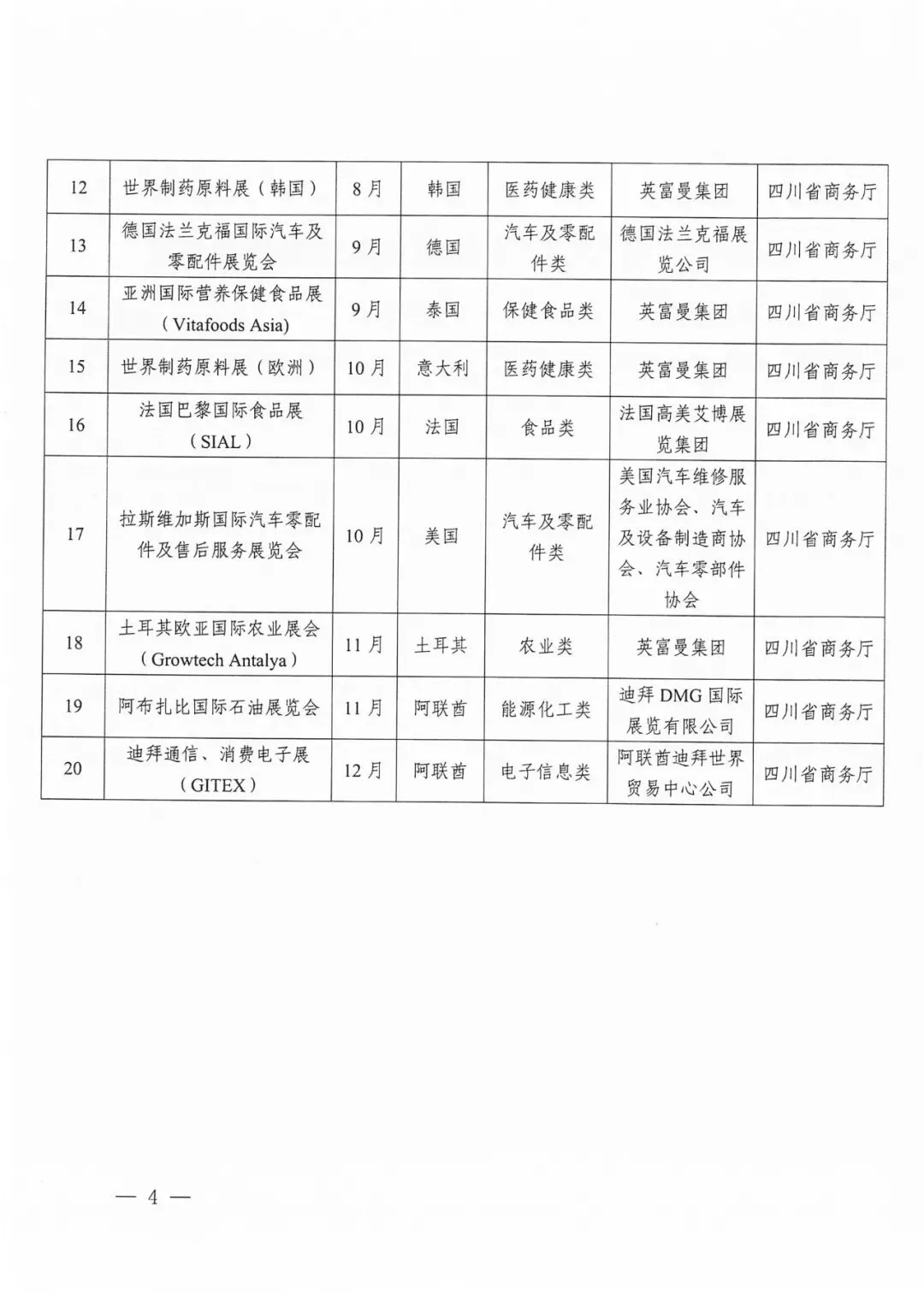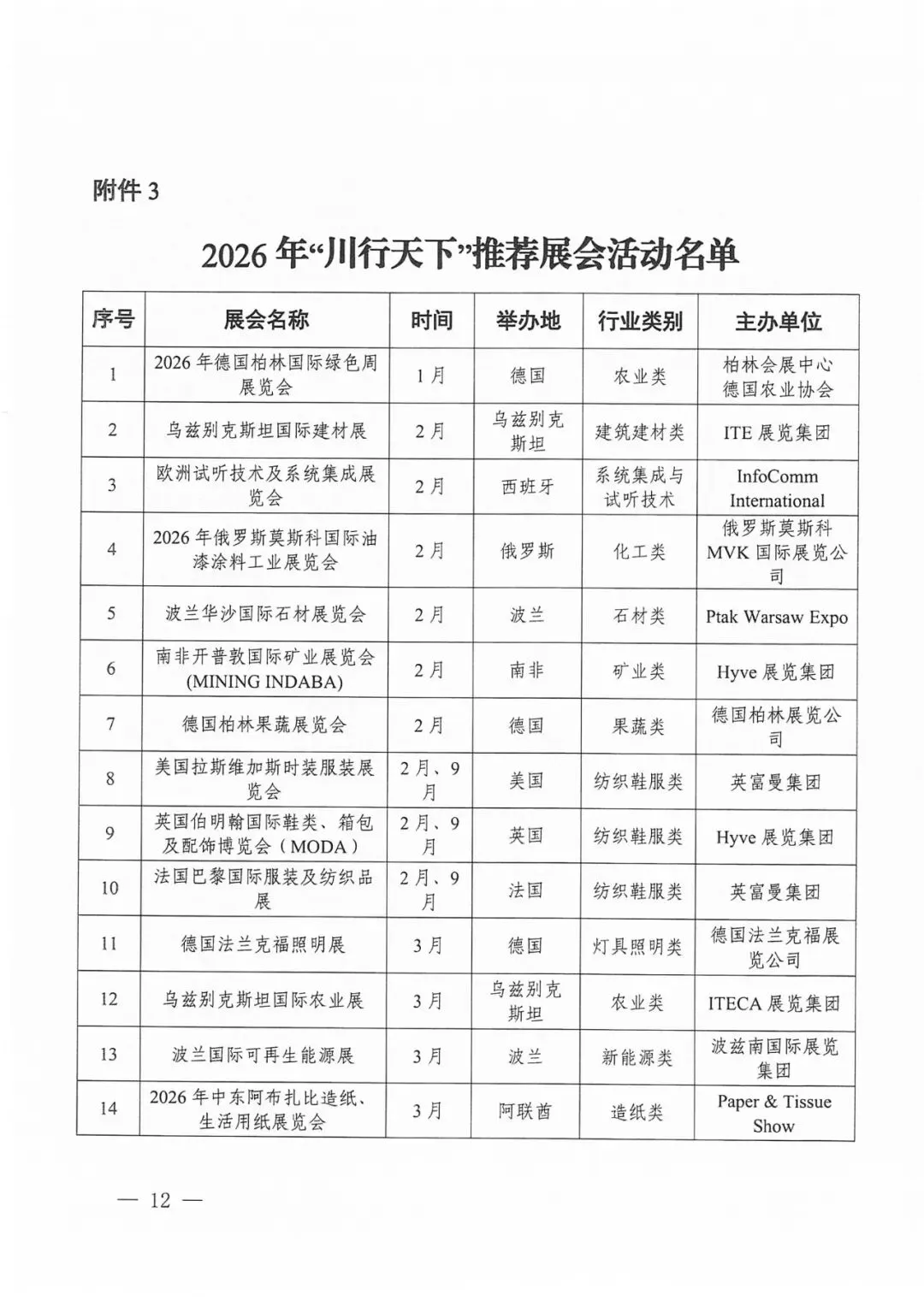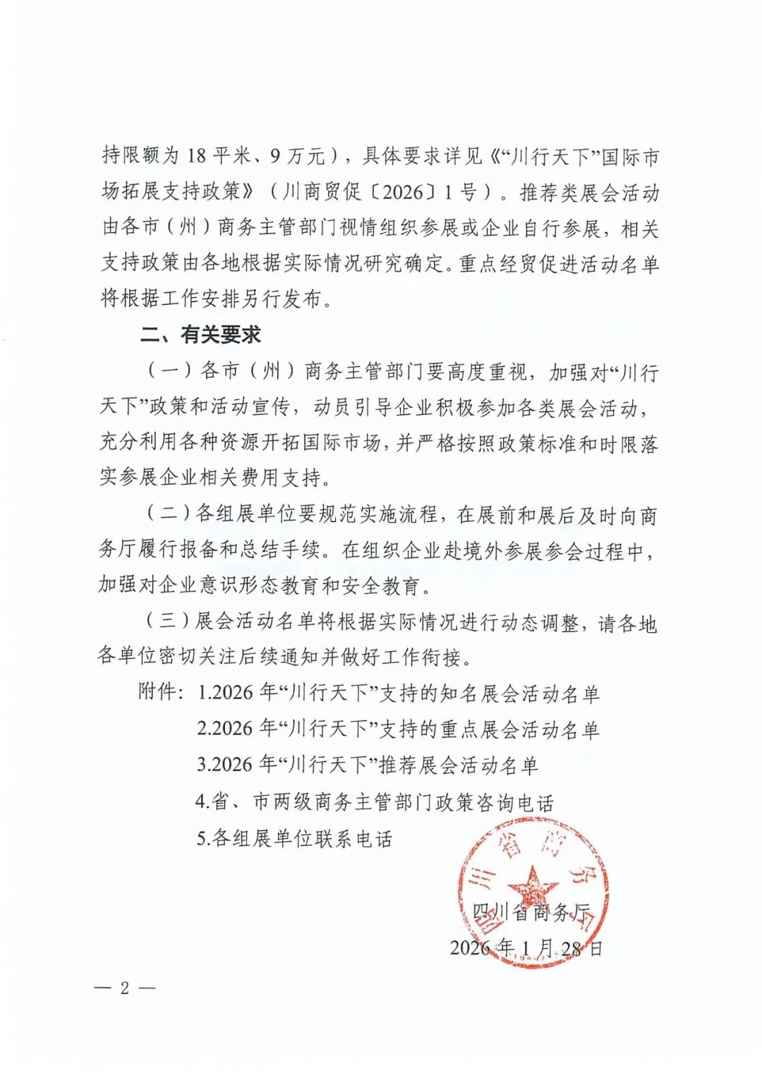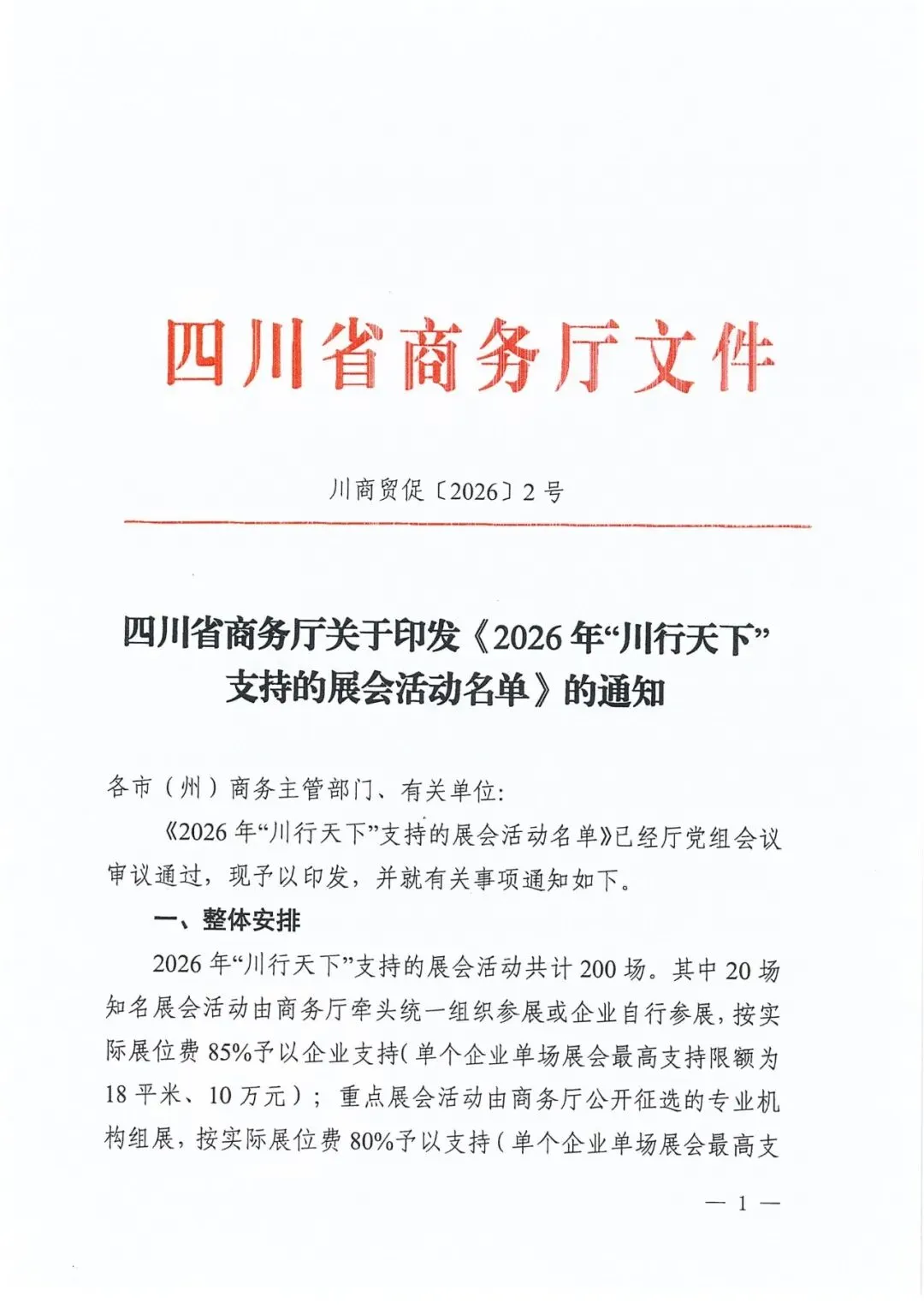 2026年“川行天下”支持的展会活动共计200场。其中20场知名展会活动由商务厅牵头统一组织参展或企业自行参展,按实际展位费85%予以企业支持(单个企业单场展会最高支持限额为18平米、10万元);重点展会活动由商务厅公开征选的专业机构组展,按实际展位费80%予以支持(单个企业单场展会最高支持限额为18平米、9万元),具体要求详见《“川行天下”国际市场拓展支持政策》(川商贸促〔2026〕1号)。推荐类展会活动由各市(州)商务主管部门视情组织参展或企业自行参展,相关支持政策由各地根据实际情况研究确定。重点经贸促进活动名单将根据工作安排另行发布。
