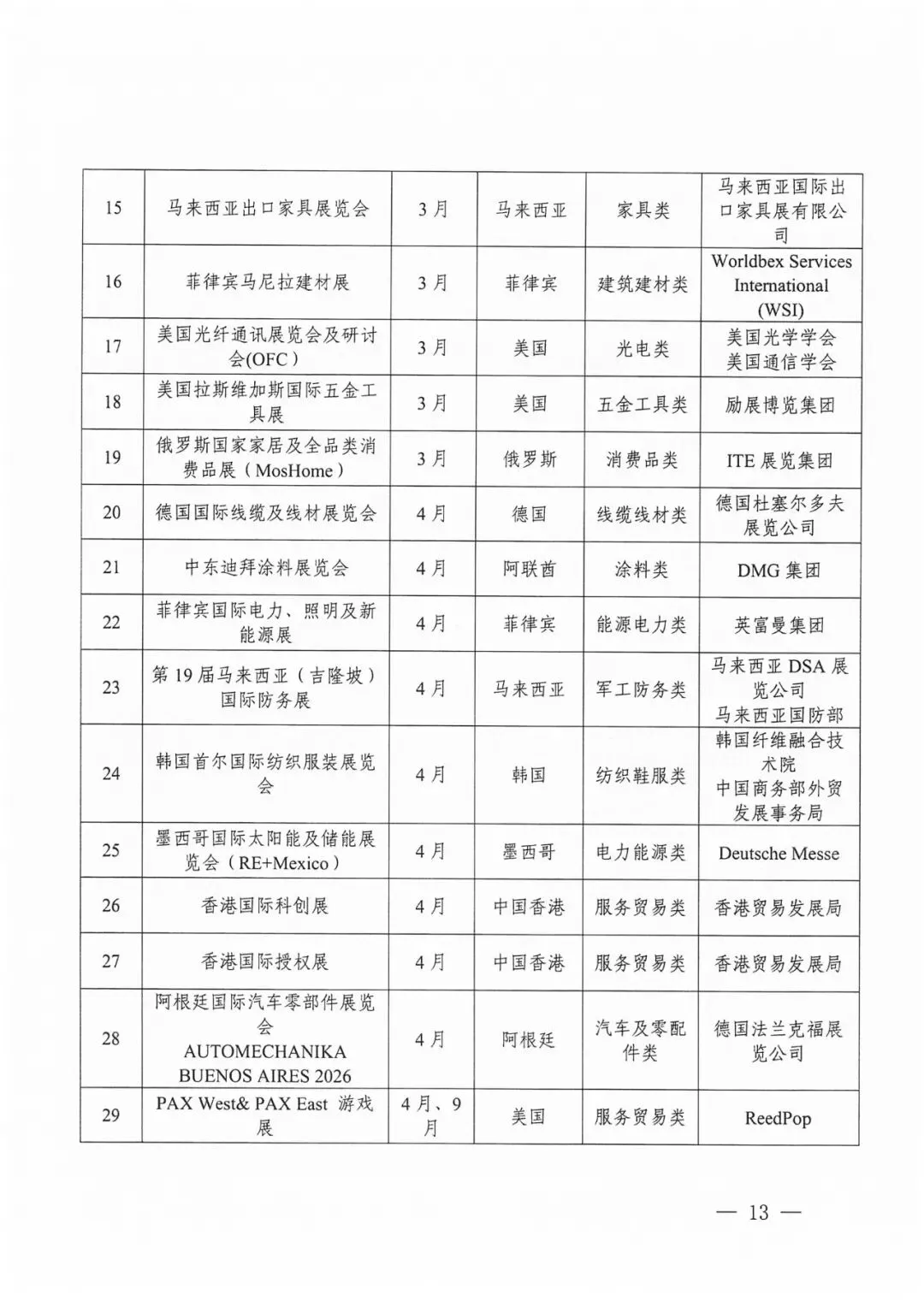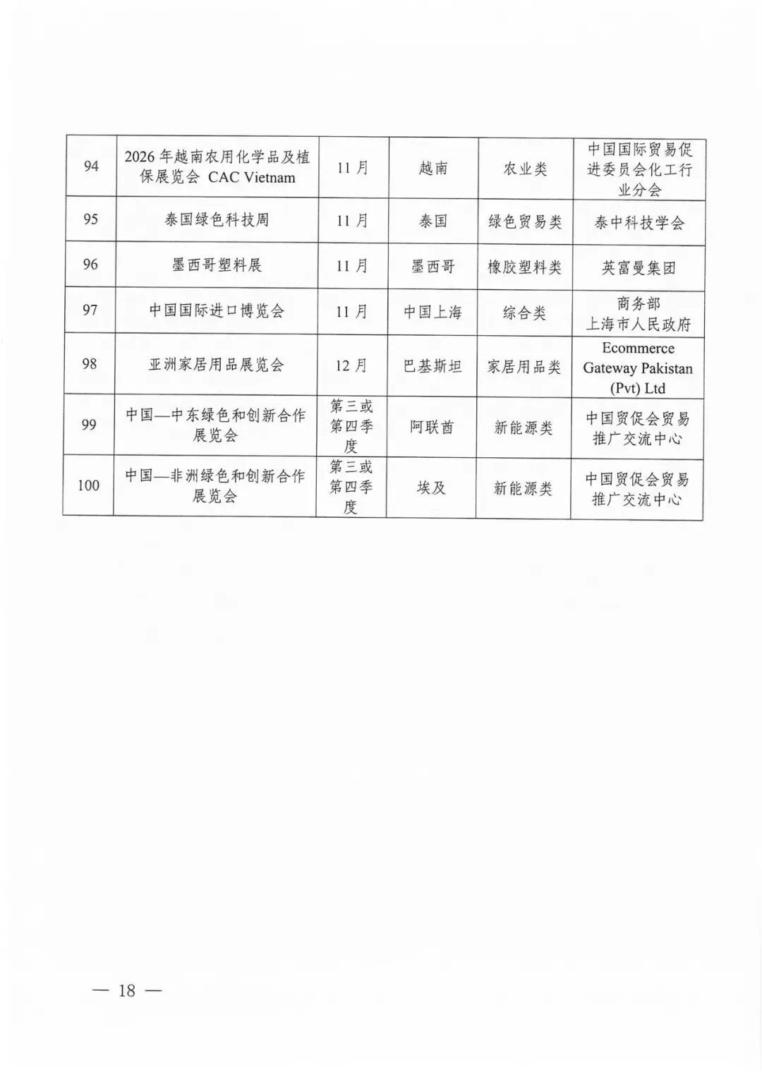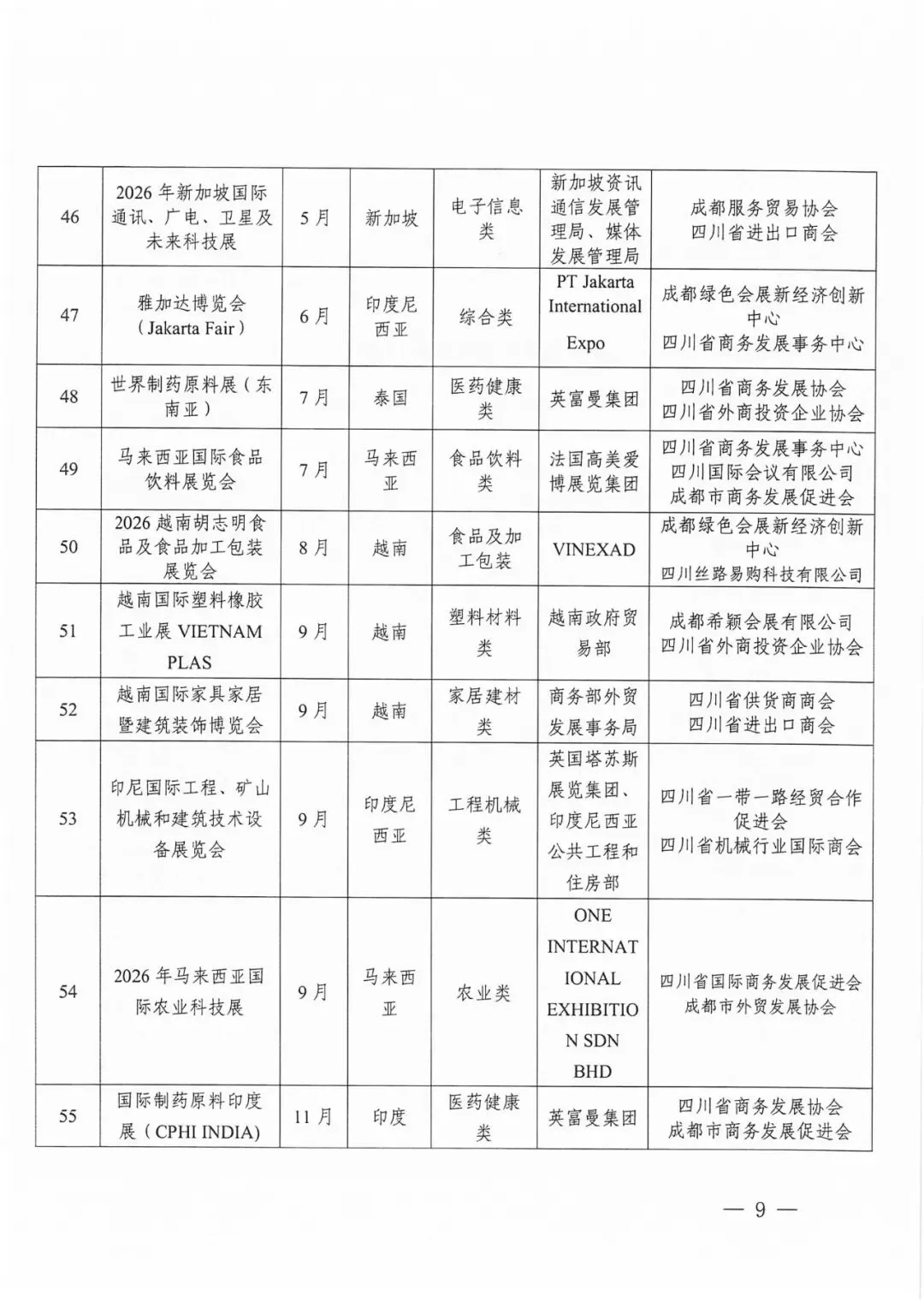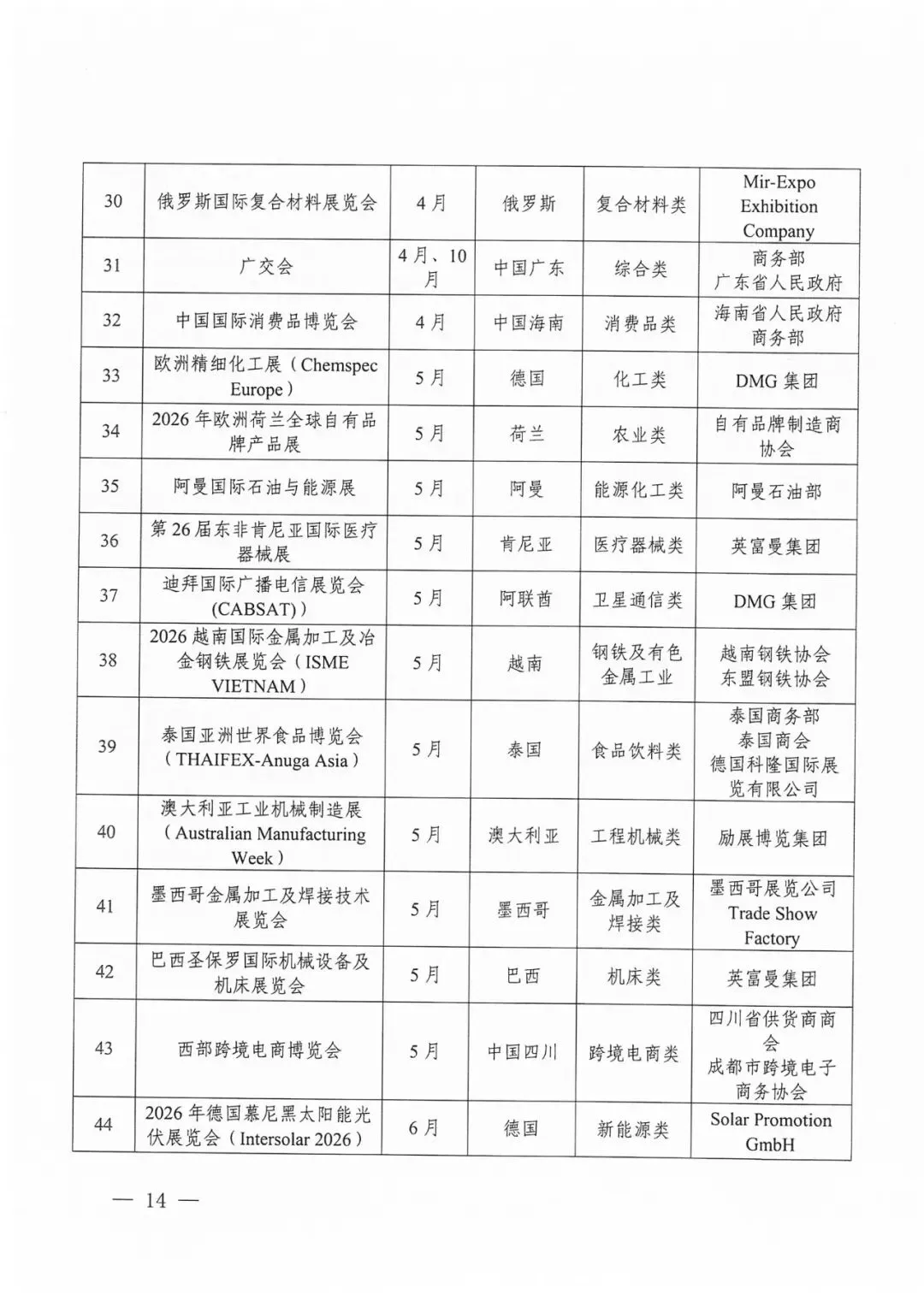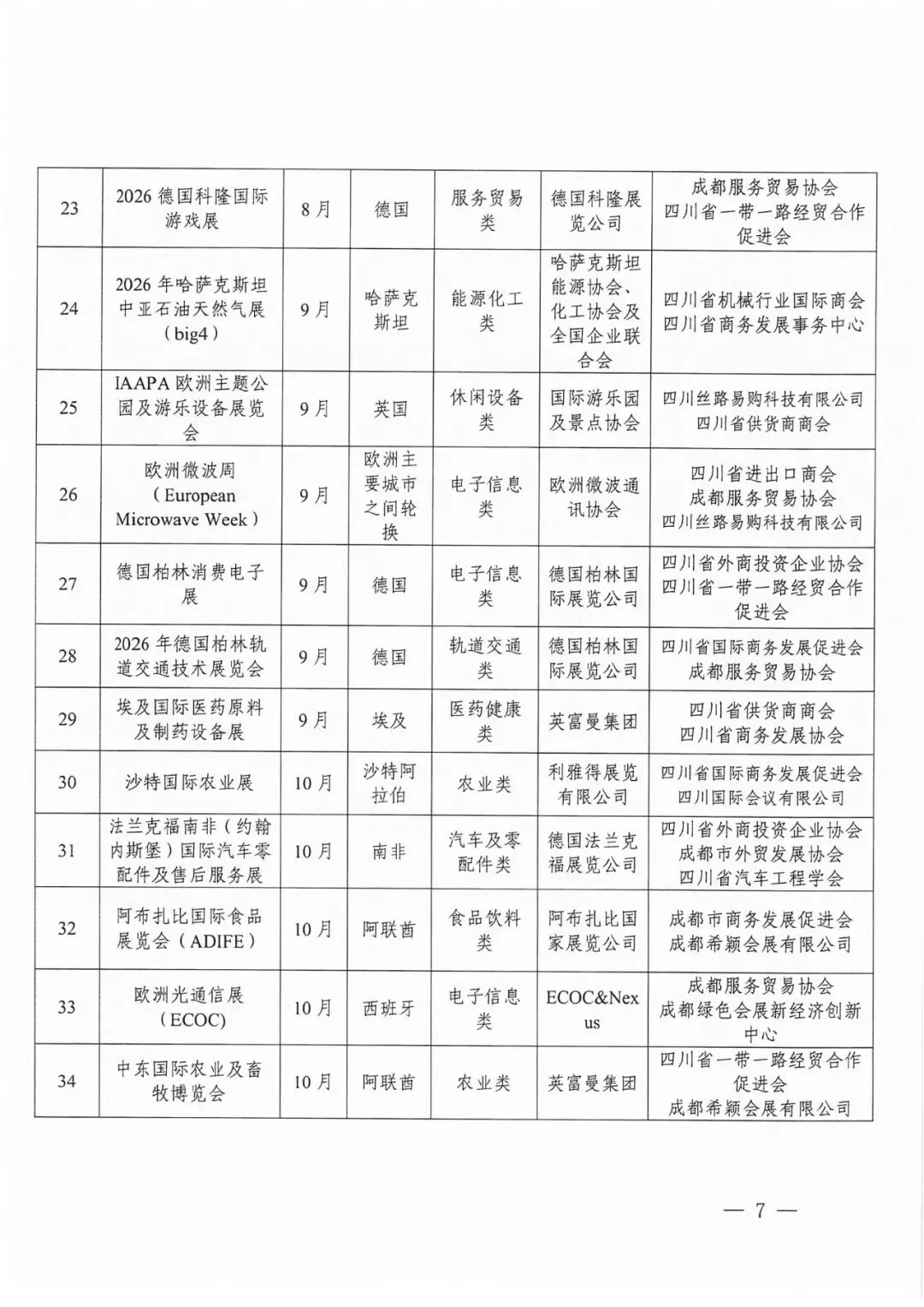 2026年“川行天下”支持的展会活动共计200场。其中20场知名展会活动由商务厅牵头统一组织参展或企业自行参展,按实际展位费85%予以企业支持(单个企业单场展会最高支持限额为18平米、10万元);重点展会活动由商务厅公开征选的专业机构组展,按实际展位费80%予以支持(单个企业单场展会最高支持限额为18平米、9万元),具体要求详见《“川行天下”国际市场拓展支持政策》(川商贸促〔2026〕1号)。推荐类展会活动由各市(州)商务主管部门视情组织参展或企业自行参展,相关支持政策由各地根据实际情况研究确定。重点经贸促进活动名单将根据工作安排另行发布。