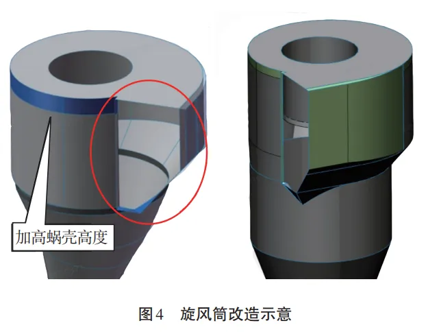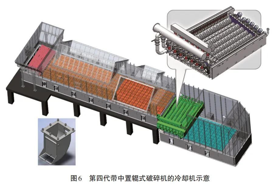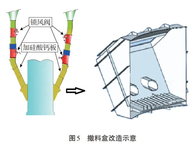 摘要:某5000t/d水泥熟料生产线烧成系统原采用双系列五级预热器系统、三喷腾分解炉和带空气梁的第三代篦式冷却机。由于生产线运行时间较长,烧成系统存在预热器系统阻力偏高、C1出口温度偏高、窑头部分冷却风机用风不合理、出冷却机熟料温度偏高及热回收效率偏低等问题。结合对现场烧成系统的热工诊断结果,对运行过程中出现的问题进行了技术分析,制定了烧成系统优化方案,并从撒料装置调整、旋风筒扩容、分解炉扩容、更换高效节能风机、更换第四代带中置辊破篦式冷却机等方面开展了技术改造。技改实施后,系统能耗进一步降低,系统阻力减小,换热效率提升,达到了预期技改目标。某水泥公司5000t/d水泥熟料生产线采用无烟 煤燃料,分解炉采用预燃炉加TSD炉,以适应无烟煤燃点高的特性,炉容偏小(约2100m3)。投产后发现,两个预燃炉的煤粉预燃效果有限,物料在分解炉内停留时间偏短,造成分解炉分解率较低,预热器对不同煤种的适应性差,能耗指标不理想。该生产线回转窑规格为ϕ4.8m×72m,熟料冷却机为第三代TC-12102篦式冷却机,出窑熟料温度偏高,能耗损失大。为进一步提高产能,降低能耗及生产成本,公司对该生产线烧成系统进行了优化技改。 2020年,回转窑标煤耗为106.14kg/t,生料喂料量为360t/h,高温风机转速为 790r/min,C1出口负压为-5200Pa。预热器系统通风阻力大,分解炉容积偏小,对原煤适应性差,煤粉燃烧不好,煤耗偏高;篦冷机热回收效率低,出冷却机熟料温度高,约160℃~200℃;第三代篦冷机故障检修频繁,对下游工序的生产维护造成较大影响。2021年3月,该公司对此5000t/d 水泥熟料生产线烧成系统进行了热工标定检测,烧成系统工艺流程如图1所示,预热器热工标定测试数据如表1所示。从表1数据分析可知,系统整体风量偏大(1.46 Nm3 /kg.cl),用煤量偏大;C1出口温度偏高(324℃),负压偏大(-5200Pa);窑内仍存在还原气氛,煅烧强度偏低(NOX-347ppm);篦冷机热回收效率不高,三次风温为884℃,烧成系统有较大优化空间。烧成系统热量平衡表的支出热量分布统计如表2所示。由表2可知,熟料形成热约占总热耗的55.1%,基本由原料及其配料方案所决定,降耗空间不大。因此,需从降低预热器系统热损失、冷却机排放废气热损失、烧成系统表面散热损失、出冷却机熟料热损失等方面进行技改。5000t/d 及2500t/d典型熟料生产线热损失分布见图2。 该项目烧成系统技改实施流程如图3所示。技改目标为改善预热器系统的气固换热效果,降低系统压力损失,提高系统分离效率;同时,将分解炉炉容增加至4000m3,为煤粉燃烧及生料分解提供足够的空间和时间;提高冷却机热交换率及设备运转率,为烧成系统长期稳定运行提供保障。预热器系统的阻力损失为各级旋风筒的压力损失与系统管道压力之和,即,最低级旋风筒进口至最高级旋风筒出口压力总损失差。预热器系统压损 每降低500Pa,可节省电耗0.66~0.77kW·h/t。烧成系统技改后预热器主机设备参数见表3。结合水泥生产线预热器改造目的,对预热器旋风筒、连接风管、撒料盒等设备的结构尺寸进行核算,对旋风筒内筒、旋风筒进口、风管有效截面积、撒料盒底部斜坡等进一步优化,拓宽预热器对原、燃料的适应性,实现提产降耗。(1)增加预热器C1~C5旋风筒蜗壳高度,同时增加相应旋风筒内筒高度,以提高旋风筒分离效率,尽可能降低系统阻力。(2)C1料管采用双道锁风阀,提高其锁风效果,降低C1出口温度。(3)采用纳米隔热保温材料,降低技改部分表面温度。(4)采用新型撒料盒,提高管道换热效率,优化系统运行。旋风筒和撒料盒改造如图4、图5所示。 在塔架外分解炉现有基础上增加一柱体,调整C5旋风筒蜗壳,用下行出炉延伸管道连接C5旋风筒和分解炉,可适当增大分解炉容积。另外,可通过C4下料,灵活调整分解炉主燃烧区流场温度。在可利用的空间内尽量增大原塔架内分解炉容积,延长物料停留时间,有利于煤粉的燃尽及出炉物料分解率的提高。 将第三代冷却机更换为第四代带中置辊式破碎机的冷却机,如图6所示。第四代冷却机的设备故障率明显降低,为烧成系统的长期稳定运行提供了很好的保障。第四代冷却机具有以下优势:(1)采用步进式无漏料输送模式,保证了较高的输送效率。(2)具有创新性篦板与密封结构,第四代冷却机磨损面积仅为第三代的15%,磨损率较低。(3)在全篦床范围内应用稳流控制阀,保证了较高的热交换率。(1)整体更换4个C1旋风筒,总高度9900mm,进口向外、向下扩展,进口面积增大,相应调整连接进风管的接口。(2)C2~C5旋风筒蜗壳部分加高1000mm,缩短柱体部分高度,调整连接进风管的接口,增加下料斜坡,人孔门移位至合适位置。(3)整套更换C2~C5旋风筒内筒挂板及挂片,加长C2~C5内筒。(4)更换入窑生料喂料管、C1~C3下料管及撒料装置,调整撒料板角度,调整下料管。整体更换C4撒料装置、下料管及C5下料管。(5)新增分解炉,分解炉从烟室拐出预热器塔架,管道上行到5F楼面后转下行,从4F楼面下方转入原TSD炉体,重新调整C4下料管及喷煤点。(6)将三次风改为单侧进风,降低三次风管高度,调整窑尾侧直径,斜度为5°,从窑中支撑后适当位置切断对接,新增脱氮风管。(7)拆除原分解炉、分解炉至C5管道及两侧预燃炉。(10)窑主传电机统一更换为高压交流电机,更换配套的变频器。 (11)拆除原第三代TC-12102冷却机、离心风机等设备设施,在原土建基础上改建
