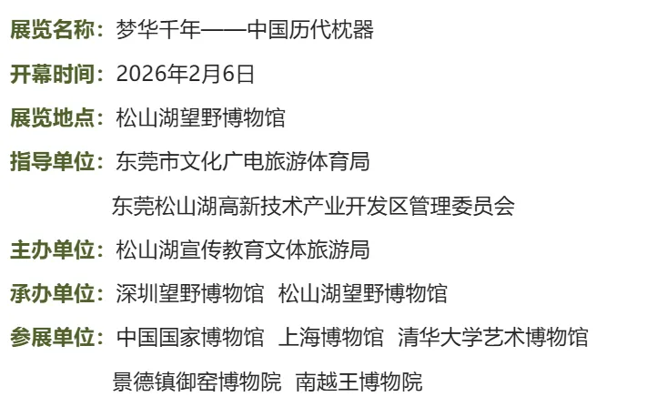 2026年2月6日,由东莞市文化广电旅游体育局、东莞松山湖高新技术产业开发区管理委员会指导,松山湖宣传教育文体旅游局主办,深圳望野博物馆、东莞市松山湖望野博物馆联合承办“梦华千年——中国历代枕器”展在松山湖望野博物馆开幕。东莞市人大常委会领导、东莞市文化广电旅游体育局相关负责领导、松山湖宣传教育文体旅游局相关负责领导、中国国家博物馆征集部研究员 胡朝辉、景德镇御窑博物院党支部书记 邹媛、景德镇御窑博物院展陈部主任 万淑芳等50余位嘉宾出席本次开幕式。