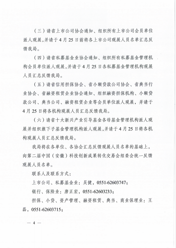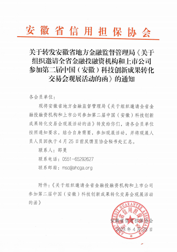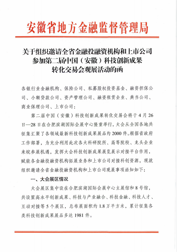 关于转发省地方金融监管局《关于组织邀请全省金融投资机构和上市公司参加第二届中国(安徽)科技创新成果转化交易会观展活动的函》的通知