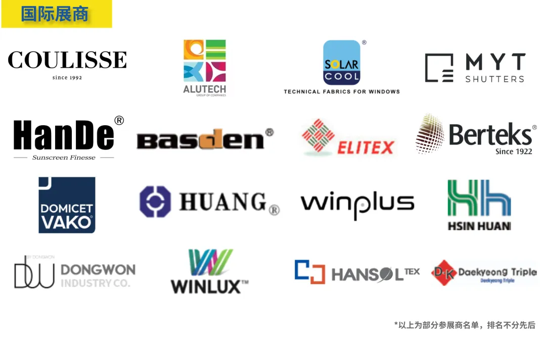 展品类别包括:外遮阳、驱动与控制系统、面饰面料、百叶窗、百叶帘、窗饰配件及机械、窗饰成品、卷帘门、工业门、车库门、庭院门、自动门、智能遮阳、门机门控等。