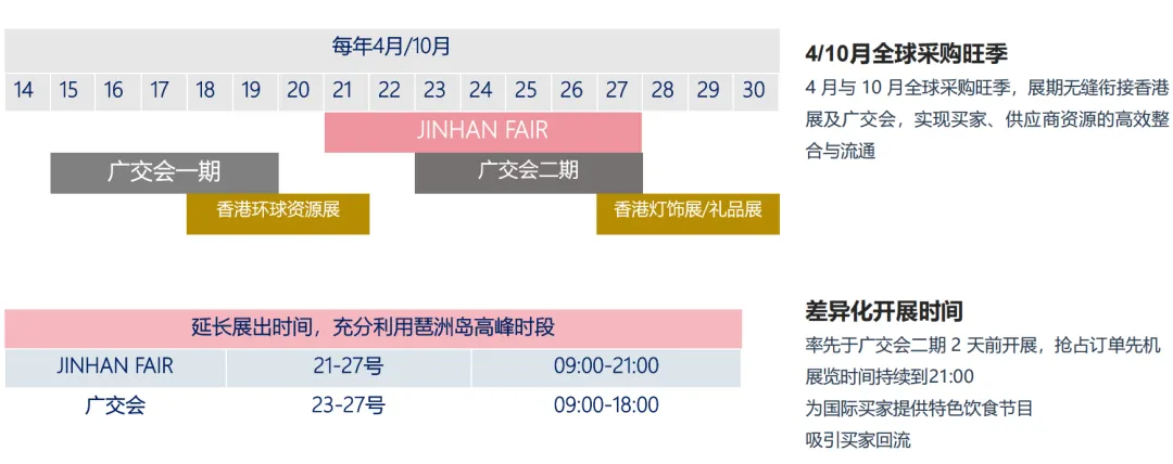 4月与10月全球采购旺季,展期无缝衔接香港展及广交会,实现买家、供应商资源的高效整合与流通。