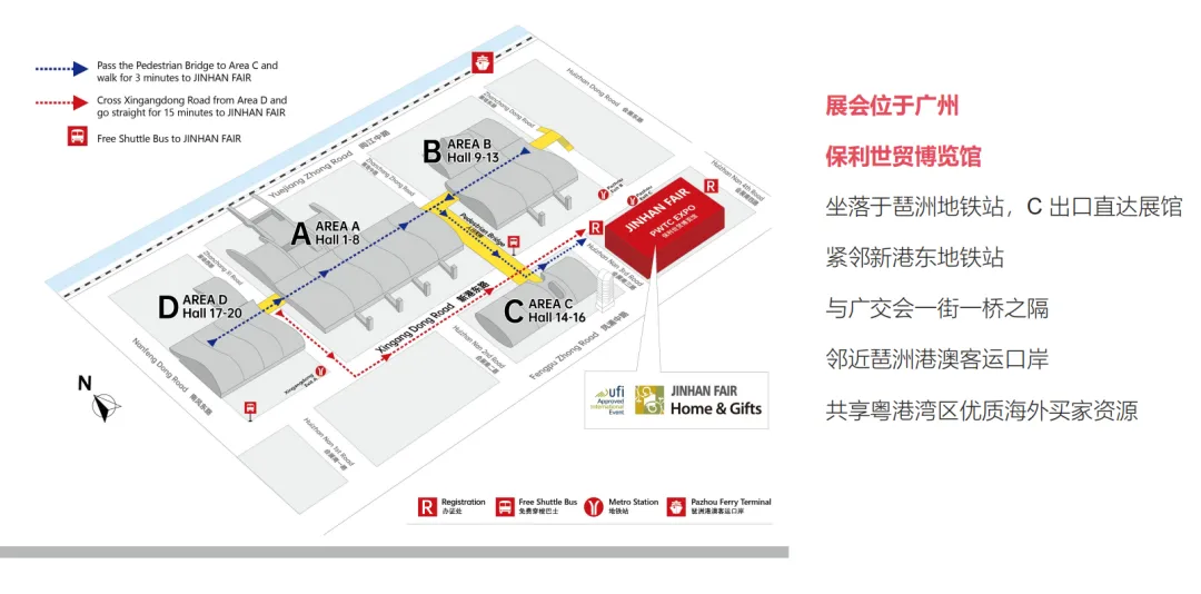 该展会位于广州保利世贸博览馆,坐落于琶洲地铁站,C出口直达展馆,紧邻新港东地铁站,与广交会一街一桥之隔,邻近琶洲港澳客运口岸,共享粤港湾区优质海外买家资源。
