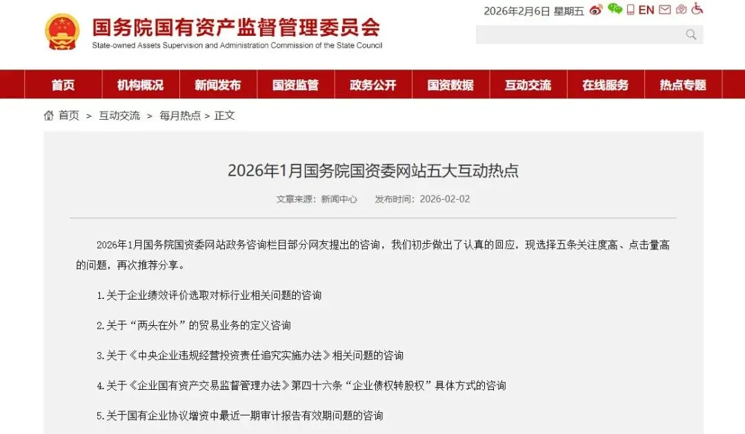2月2日,国务院国资委在对2026年1月官网政务咨询栏目部分网友提出的咨询初步作出了回应的基础上,选取了5条关注度高、点击量高的问题,再次推荐分享。