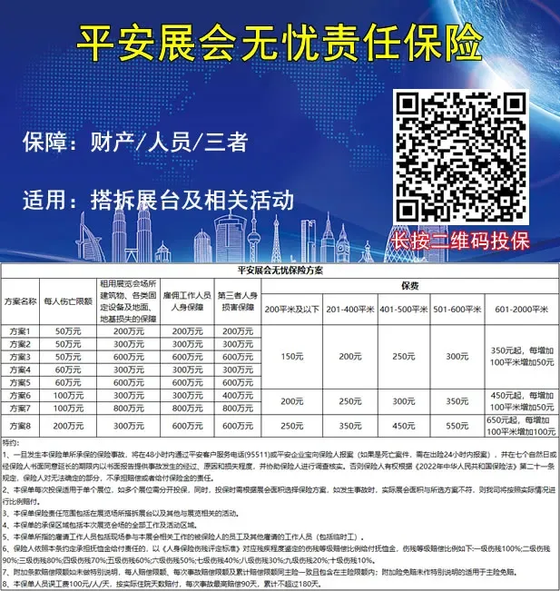 个人单位均可投,8种方案,保展览场所搭拆展台及其他展览相关活动、保障责任涵盖雇佣工作人员包括临时工、承保租用展览会场所建筑物、固定设备、地面地基损失、保费150起,面积可保2000平米内、在线直投无需盖章,秒出保单,支持在线批改,秒出批单。