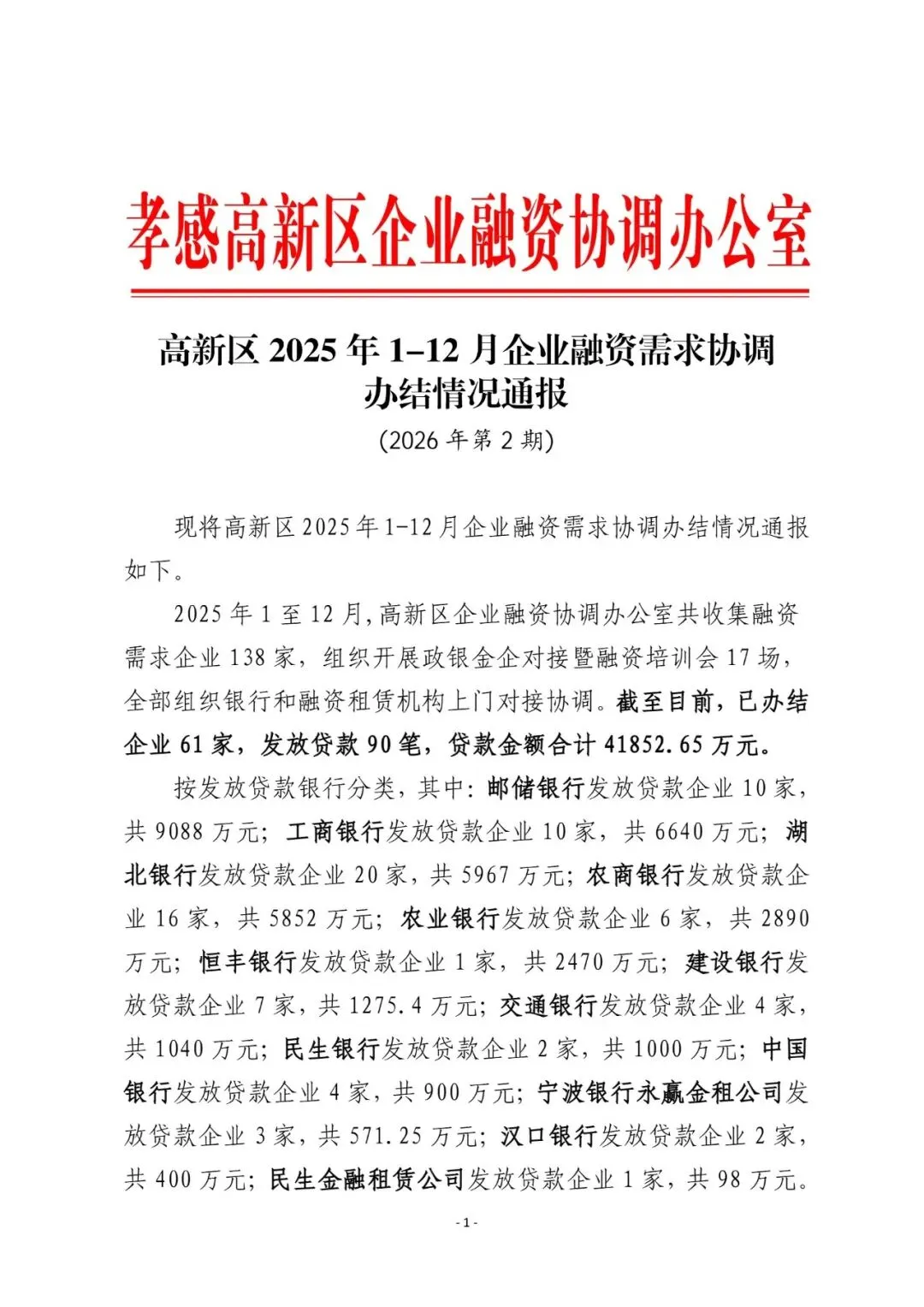 现将高新区2025年1-12月企业融资需求协调办结情况通报如下。