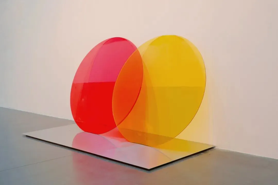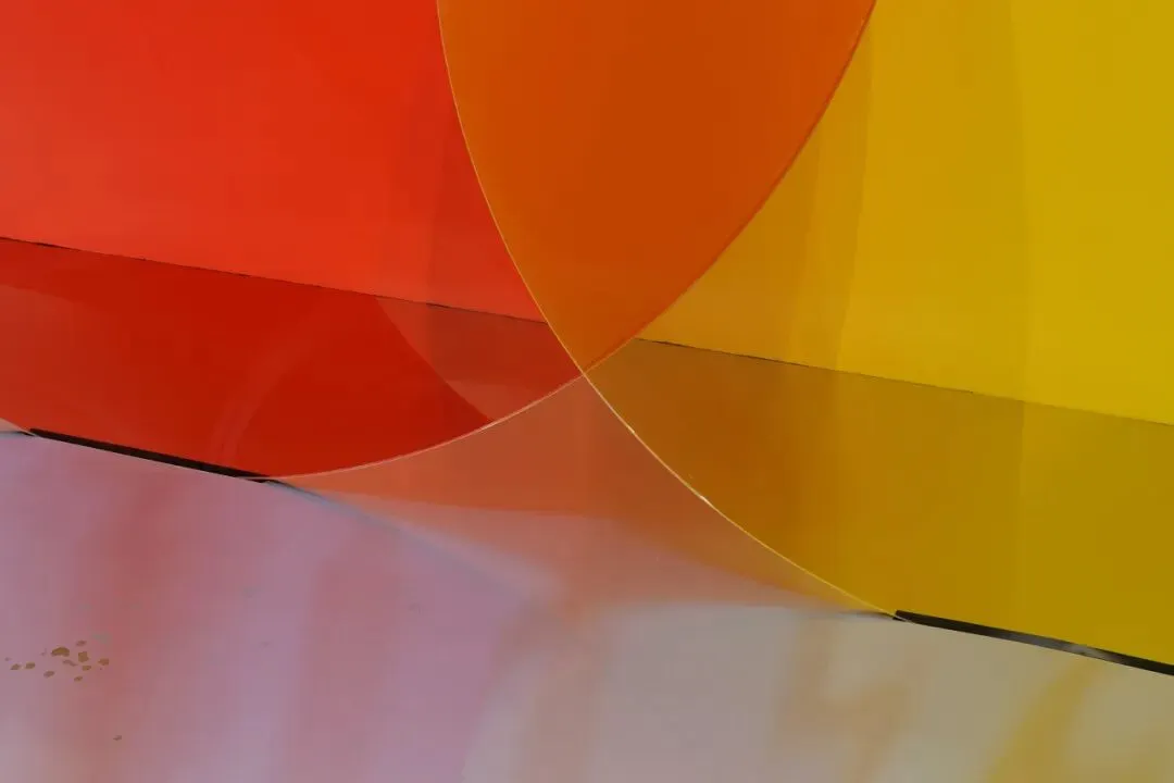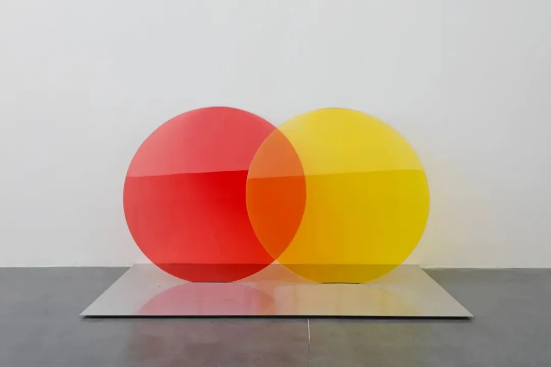 《团结与连接》由相互交叠的两片红黄色玻璃制成,宛如被放大的万事达标志,作为纯粹符号存在。玻璃反光既让人联想到以霓虹灯招牌为代表的商业照明系统,也指向后现代图像中的过度可见与视觉饱和,在倾斜与坍塌中暴露不确定性。