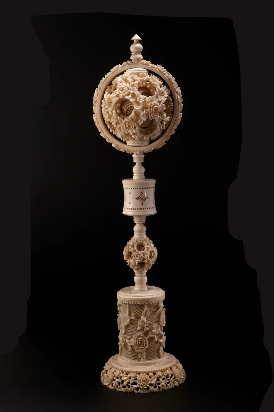令人惊叹的,是这层层相套、层层可转的结构和极其繁复精致的纹样背后,还藏着几乎违背直觉的制作方式——整颗象牙球不是由多个部件拼接而成,而是从一整块实心象牙中“掏”出来的。