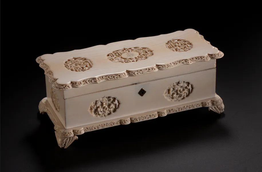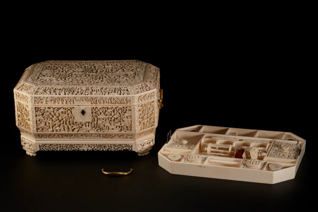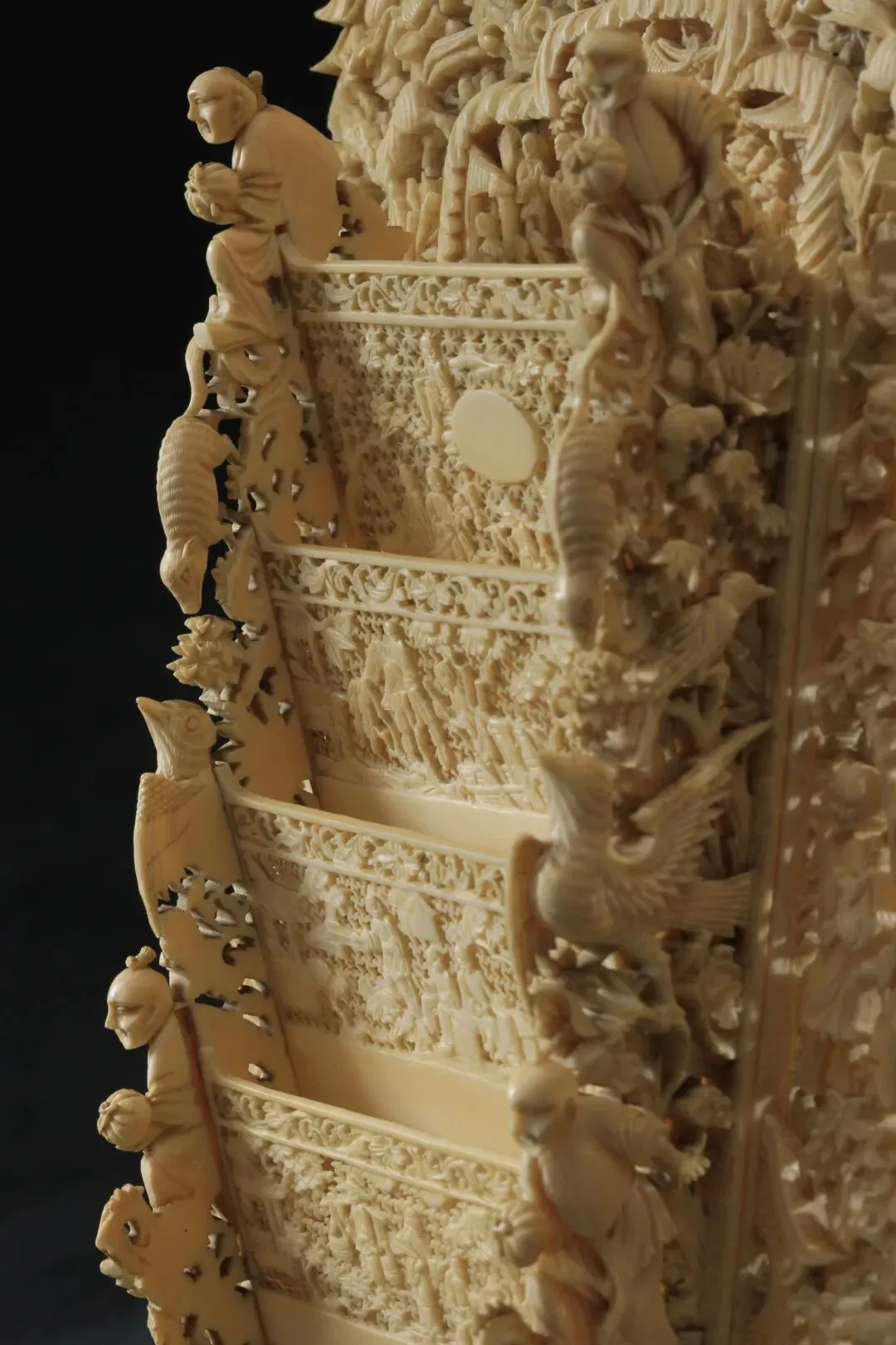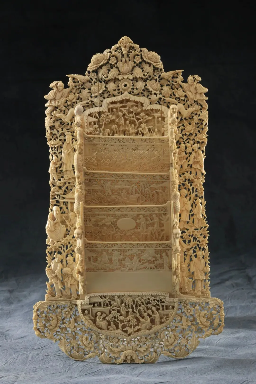 清代乾隆年间推行“一口通商”后,广作牙雕制品随“海上丝绸之路”贸易进入西方。匠人根据外国客人需求生产相应商品,其中既保留了中国传统元素,又呼应了西方文化审美,使广作牙雕在技法、风格上中西合璧、独领风骚。大量西方人在接触到精美的牙雕制品后,既满足了他们对遥远东方的好奇心,也一定程度上影响了西方的制作工艺和审美情趣。
