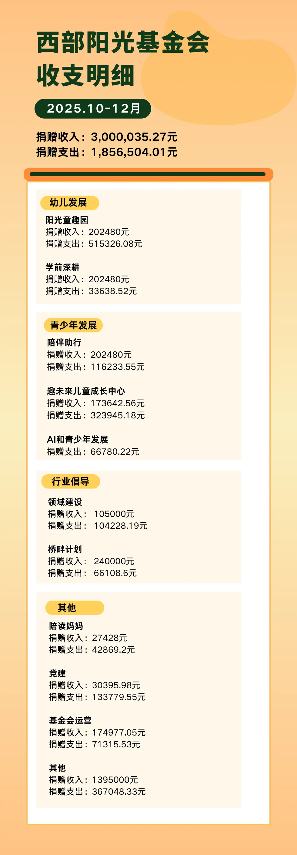 2025年10月1日–12月31日,基金会总收入3,000,035.27元,总支出1,856,504.01元,主要投入于项目执行与机构运营。西部阳光月捐伙伴计划共有832人次捐赠,合计捐赠60807.35元。