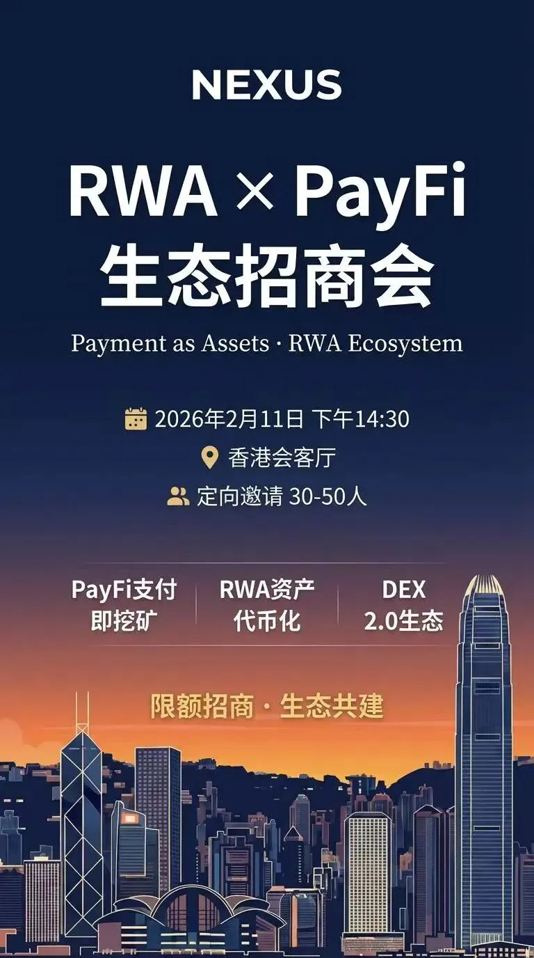 2024年,Hyperliquid的百倍空投神话让无数人扼腕叹息。 那些早期参与者,仅仅因为一次简单的交互,就获得了改变命运的财富。历史总是惊人的相似,但机会不会永远等待。 2026年,RWA(现实世界资产)赛道全面爆发的前夜,Nexus带着PayFi革命来了。 这一次,你还要做旁观者吗?如果说DeFi解决了链上资金的流动性,那么 PayFi(支付金融)则是打通现实世界与Web3的最后一块拼图。支付即资产的革命:传统的支付是消费的终点,但在Nexus生态中,每一次支付都是资产增值的起点。万亿级RWA市场:从房地产到供应链金融,万亿级现实资产正在寻求上链机会,而Nexus提供了最佳的基础设施。DEX 2.0的崛起:数据显示,去中心化交易所的交易量正在逐步吞噬CEX的份额,透明、安全、可组合性是未来的唯一答案。无论你是商家、项目方还是投资者,都能在这里找到属于你的红利:?️ 对商家/企业:不再只是被动等待客户付款。接入Nexus PayFi,您的客户在付款的同时就在为您进行质押挖矿,让现金流变成"增值流"。? 对项目方:早期入驻生态,意味着你是规则的制定者之一。更重要的是, 让你的代币拥有真实的应用场景,实现生态可持续化发展 ,而不再只是空中楼阁。? 对投资人/KOL:RWA是2026年最大的叙事。在这里,你能接触到最前沿的项目,把握赛道早期的百倍机会。核心议题:深度解析PayFi"支付即挖矿"模式、RWA资产代币化实操方案、DEX 2.0生态红利。闭门形式:我们拒绝走马观花的大会模式,坚持"小规模、高密度",确保每一位参会者都能进行一对一的深度洽谈。资源链接:现场汇聚行业顶尖资源,直接对接技术、资金与流量。本次活动仅限额 50人 ,且采用 严格审核制 。 我们深知,真正有价值的合作往往诞生于深度的交流中。为了确保每一位嘉宾都能获得充分的关注和一对一的沟通时间,我们必须严格控制人数。这不仅仅是一个参会名额,更是生态早期合作伙伴的珍贵席位。机会稍纵即逝,红利只留给行动派。 别让2026年的遗憾,重复2024年的故事。时间: 2026年2月11日 下午14:30-17:30https://wj.qq.com/s2/25724122/36c0/⏰ 报名截止: 2026年2月7日 晚上24:00 ? 结果通知: 2026年2月9日 上午10:00? 点击下方链接填写报名问卷 (审核制,请务必填写正确邮箱)