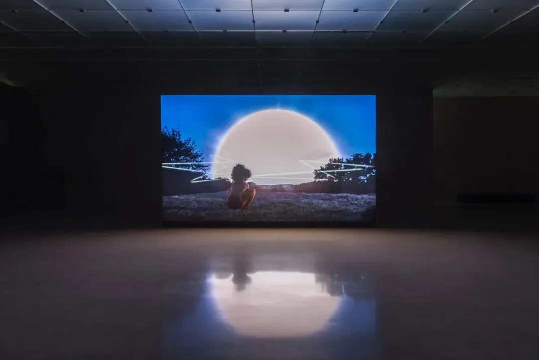 在美术馆顶层展出的影像作品中,一个蹲伏的背影坐在草地上,前方浮现出一个发光的气态体。暮色渐沉,镜头缓缓推近又拉远,这其间仿佛经历了昼夜交替,时间亦在倒流。作品中的动态变化微乎其微,改变的唯有视角与事件可被追溯的观念。