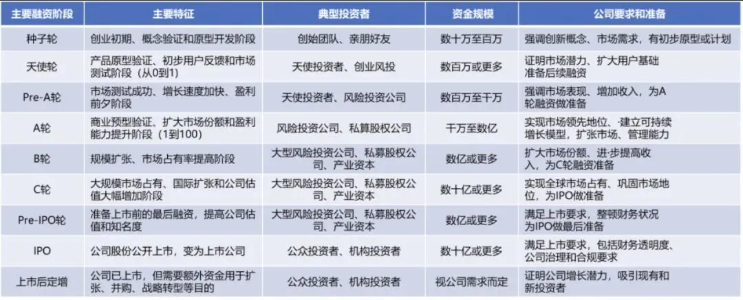 从最初商业想法到公司成功上市,需要经历融资五个阶段,预种子轮(Pre-Seed)、种子轮、A轮、B轮和C轮,直到上市、并购、整合的32个里程碑。