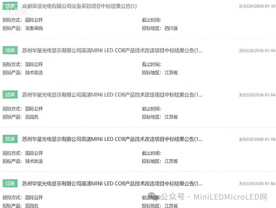 据必联网披露信息,2026年1月,新益昌固晶设备先后中标辰显光电设备采购项目、苏州华星光电显示有限公司高清MINI LED COB产品技术改造项目。