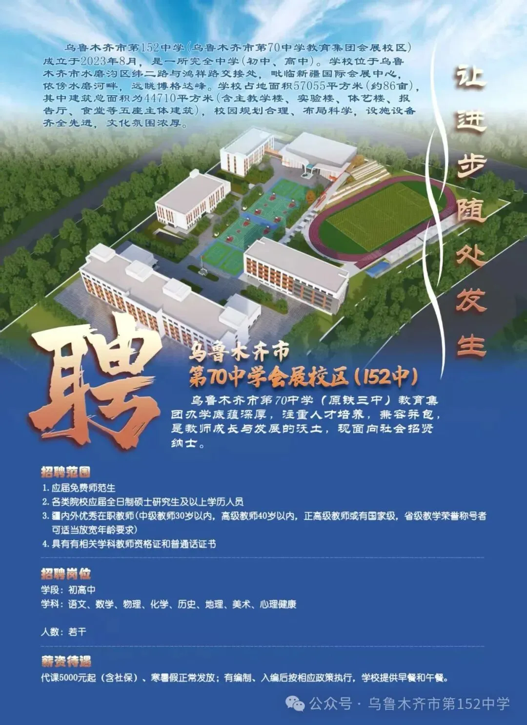 春启新程,智汇良师。乌鲁木齐市第七十中学会展校区(152中)迎来发展新契机,2026年9月高中部将正式开办,初中部同步扩招,为适配学校办学规模拓展与教育品质提升,我校已广纳国内外优质学校优秀教师,现启动教师补充招聘,持续汇聚教育英才,夯实师资力量,携手共赴新程。