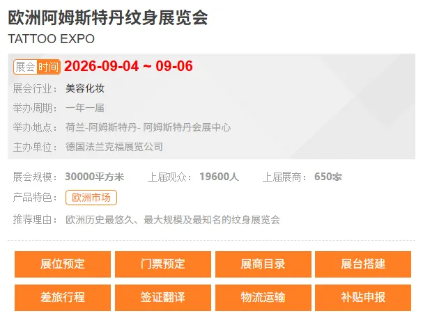 [展位预定、门票预定、展商目录、展台搭建、差旅行程、签证、翻译、物流运输、补贴申报]