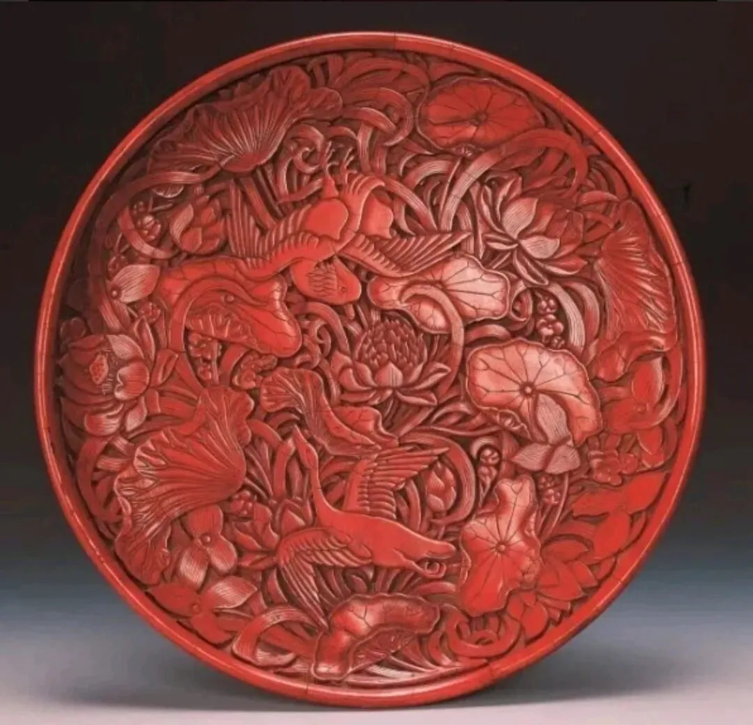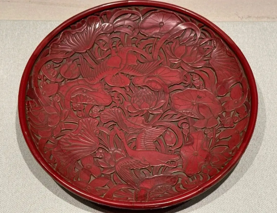 剔红荷塘双鸳纹圆盘,明代,辽宁省博物馆藏