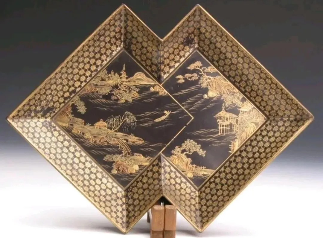 黑漆描金彩绘山水纹方胜式盘,清代,沈阳故宫博物院藏
