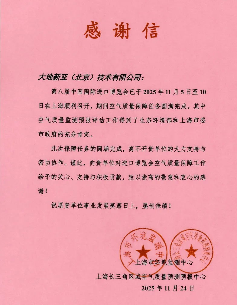 这份保障底气,源于天象新亚长期积淀的技术实力与深度协作的坚实基础。公司与生态环境部长三角区域预报中心保持长期深度合作,在建党 100 周年、历届进博会等重大任务保障工作中,已形成覆盖 “立体监测 - 多源数据调度” 的全流程技术能力。公司持续扩大区域立体气象观测服务范围,预报数据产品已纳入上海市环境监测中心常态化应用体系,为进博会 “零碳办博” 提供专业量化支撑;更凭借稳定可靠的服务,连续七年荣获上海市环境监测中心及生态环境部长三角区域预报中心的感谢信。从黄浦江畔的精准预警到长三角的协同防控,天象新亚以技术升级攻坚“进博蓝”,圆满完成第八届进博会空气质量保障任务。未来,公司将持续以卫星遥感与气象分析为核心突破点,在移动及固定扬尘源管控、大气污染精准监测等领域深化创新,为更多重大活动与区域治理提供“技术先进、响应迅速、协同高效”的环境保障服务,用科技力量守护蓝天净土,助力绿色发展。