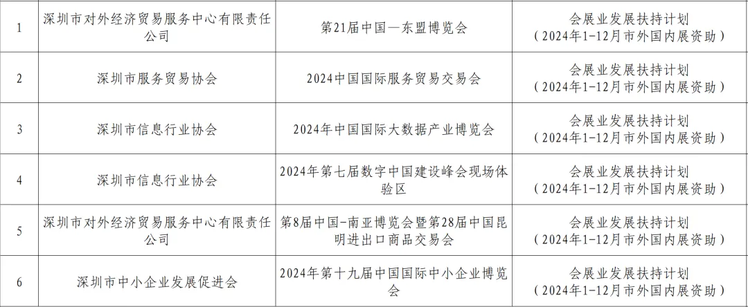 《深圳市商务局关于下达会展业发展扶持计划(2024年1—12月新引进国内外知名品牌展会扶持项目)资助计划的通知》https://commerce.sz.gov.cn/xxgk/qt/tzgg_1/content/post_12632353.html