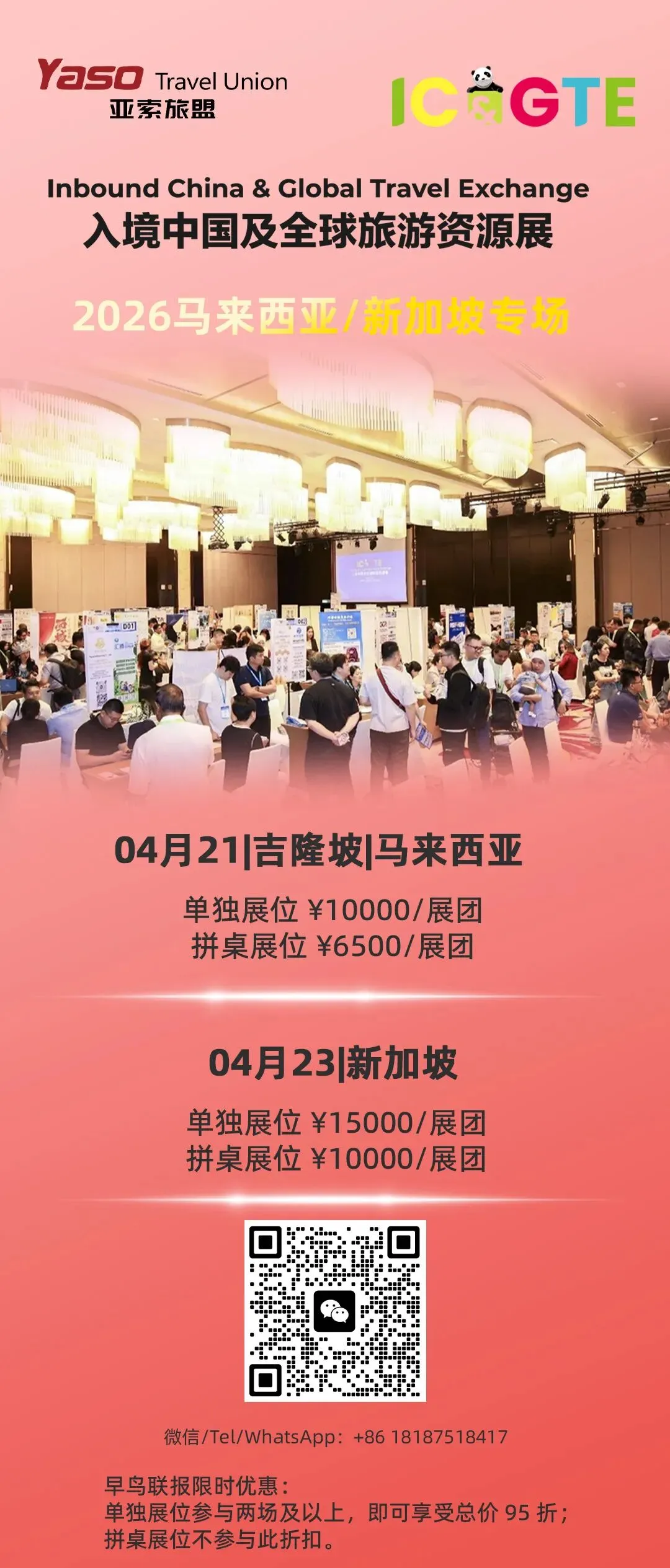 亚索旅盟 Yaso Travel Union 拥有丰富的海外旅游资源与本地化商务网络,尤其在东南亚市场根基深厚,能为参展企业提供从资源匹配、商务接洽到落地执行的全链路支持。博信会展具备超过12年B2B旅游展会运营经验,旗下品牌“COME”已覆盖中国20个核心客源城市,积累了大量优质买家资源与成熟展会服务体系。此次双方达成战略合作,旨在整合各自领域的优势资源,通过高效协同与深度联动,共同打造更高规格、更精准对接的展会平台,全力保障参展企业的洽谈效果与合作体验。展会采用“一对一桌面对接”模式,每城仅举办一天,聚焦高质量B2B洽谈。2025年IC>E首展于吉隆坡成功举办,共吸引:? 而今年,我们的加入,将为IC>E带来更多可能——亚索旅盟Yaso Travel Union 凭借在东南亚市场深耕多年的本地资源网络与商务洞察,将为展会注入更精准的买家邀约、更落地的商务对接支持,以及更持续的跨境合作跟进服务。如中国地接社、景区、酒店、交通服务、旅行社等,专注于接待入境游客的各类服务商。包括海外目的地DMC、地接社、酒店度假村、景点、旅游交通、票务及数字化平台等。企业专属背景板(含设计与搭建)我们开放多项品牌展示与商务合作资源,包括全场冠名、茶歇赞助、会刊广告、现场展位升级等,欢迎有意向的企业与我们联系,定制专属合作方案。