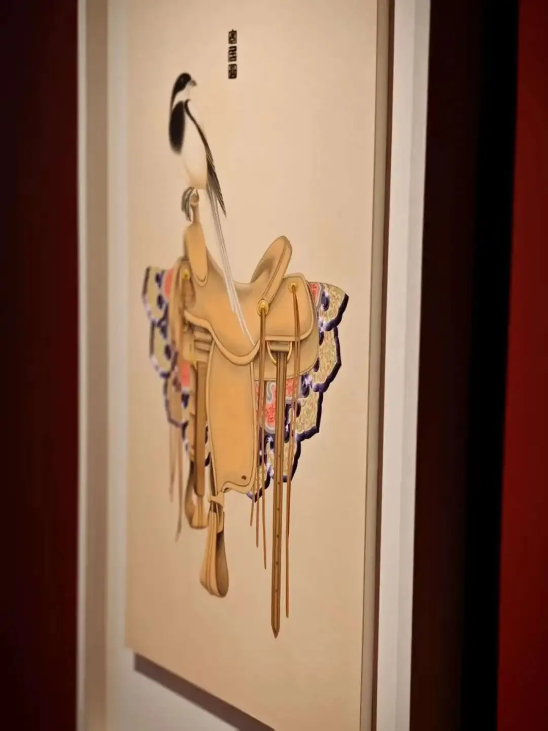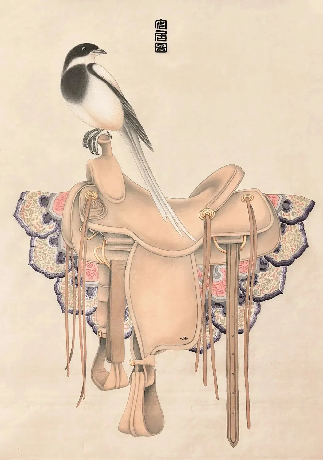 《安居图》是以马背、马鞍为主要表现对象的画作。借安字的谐音,寓意安居乐业。马背上的马鞍以龙袍、云间等描绘。寓意着龙马精神、吉祥祥云的美好寓意,喜鹊登门喜事盈门。龙袍上的江崖海水或者云间上的祥云边采用苏绣的表现形式和工笔画完美地结合。