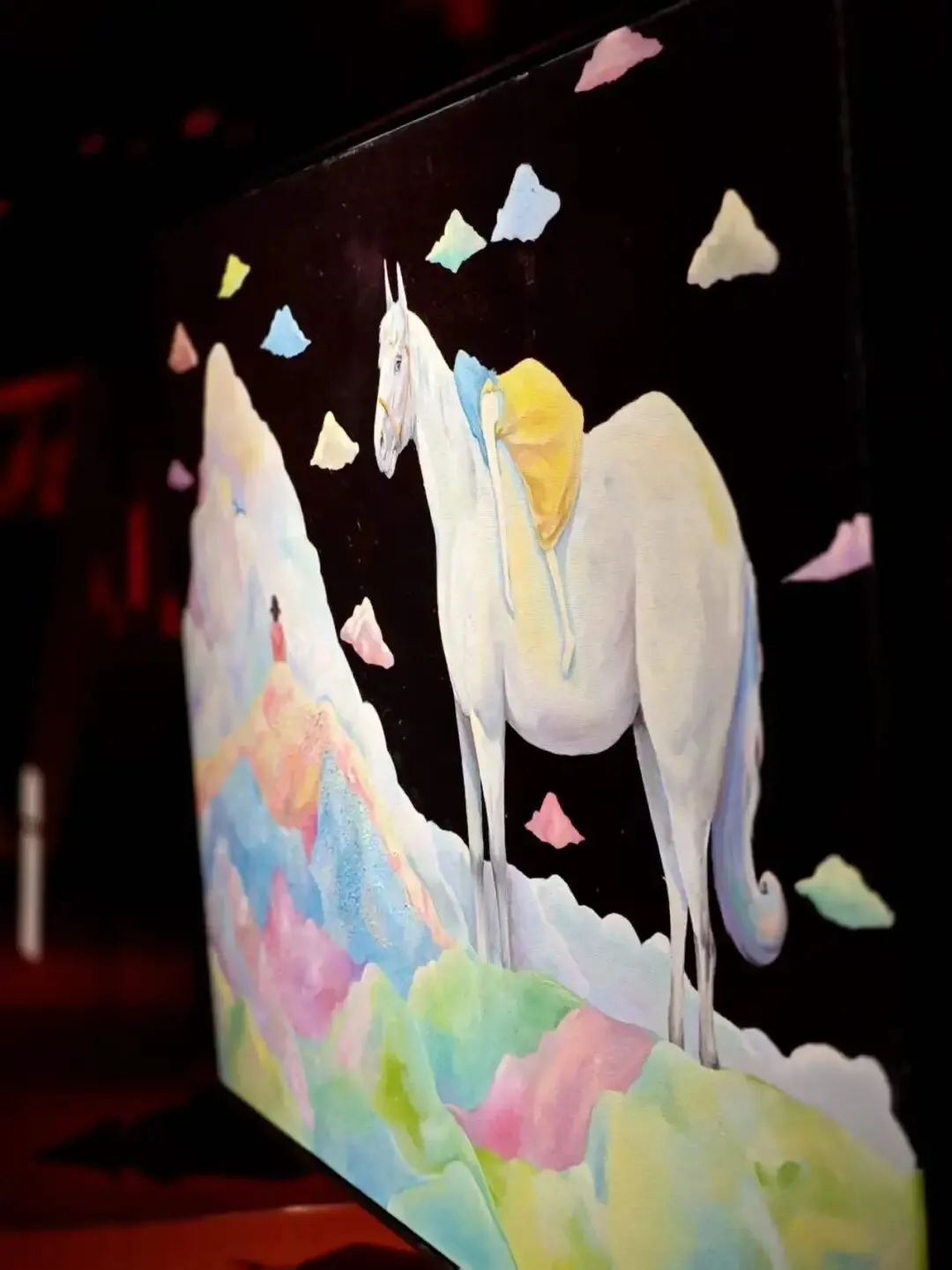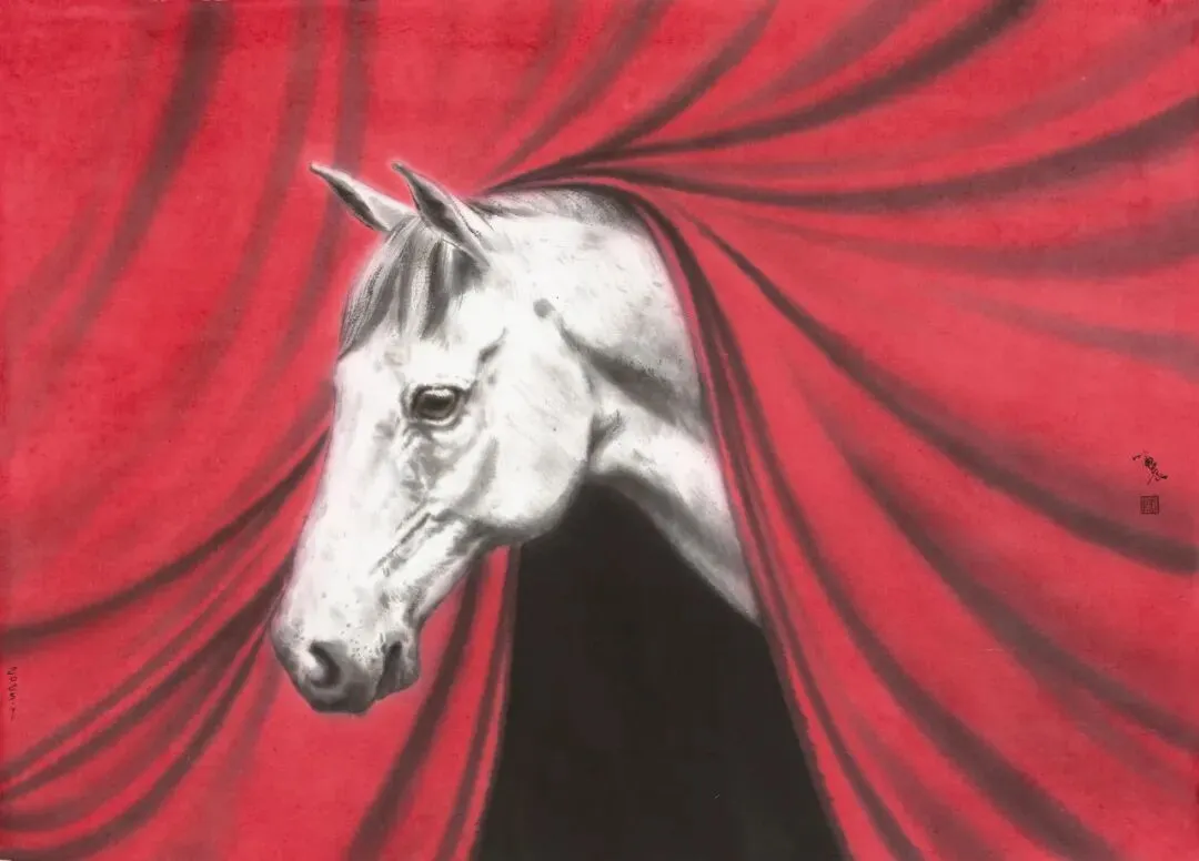 《启幕》中,白马透过红色帷幕,褪去了规训的枷锁,带着一种无所畏惧的神情,是温和地打破桎梏、唤起内心冲动的具象化表达。是奔赴自由的序幕,也是自我与世界对话的全新开端。